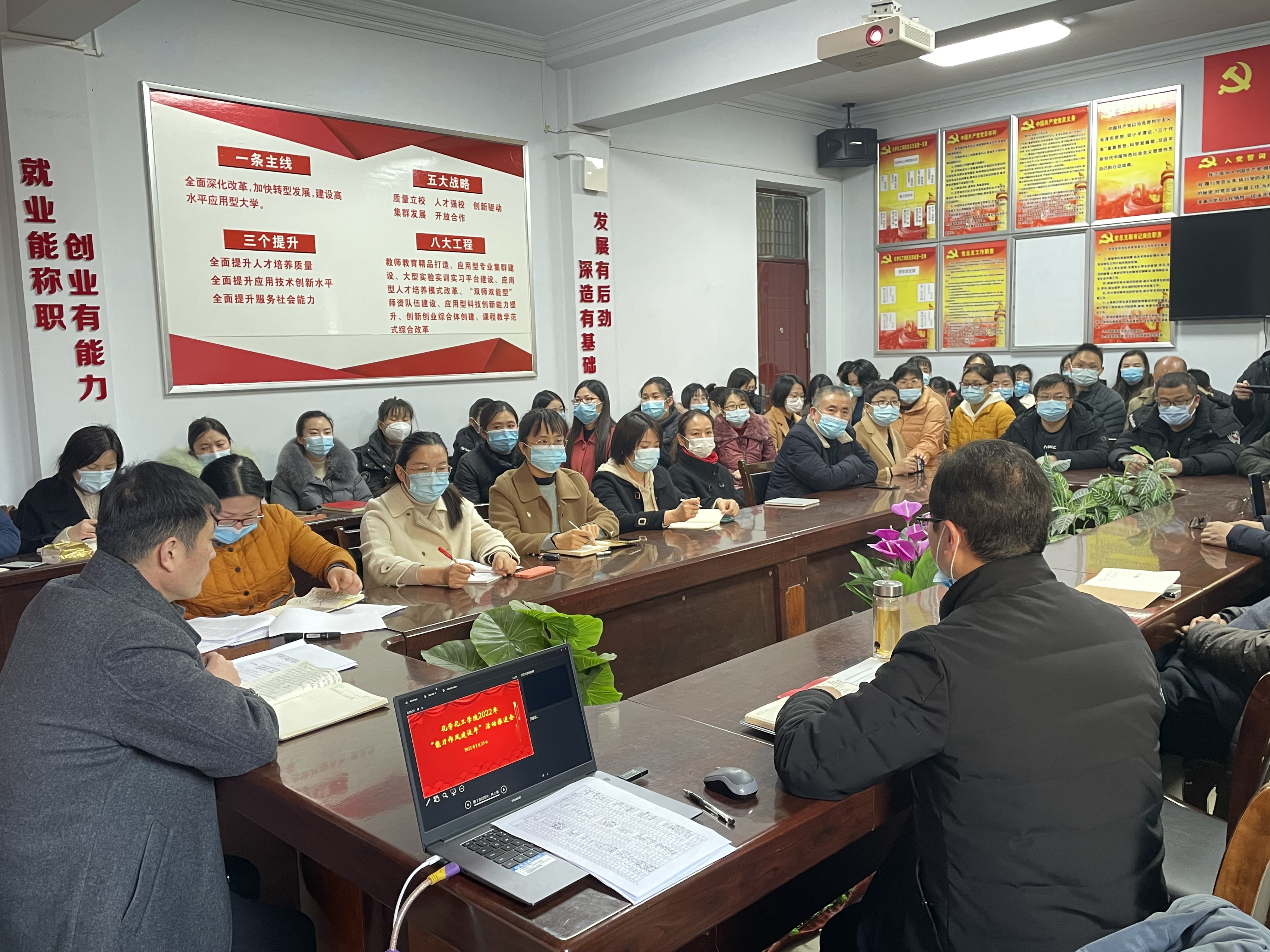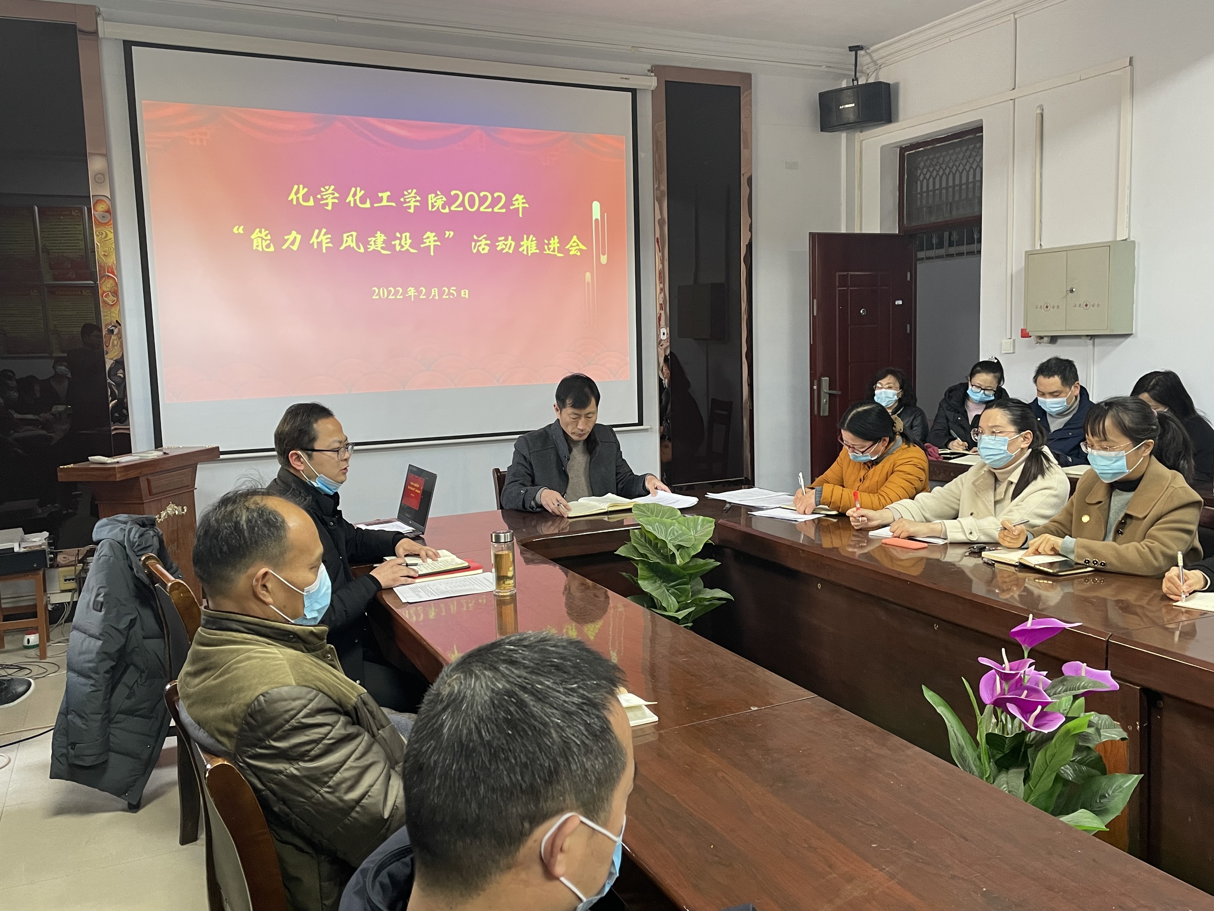 2022年2月25日,化学化工学院在睢阳校区7号楼会议室召开“能力作风建设年”活动推进会,学院党委书记李海涛、党委副书记张颜梅、副院长王涛以及全体教职工参加会议。会议由李海涛主持。