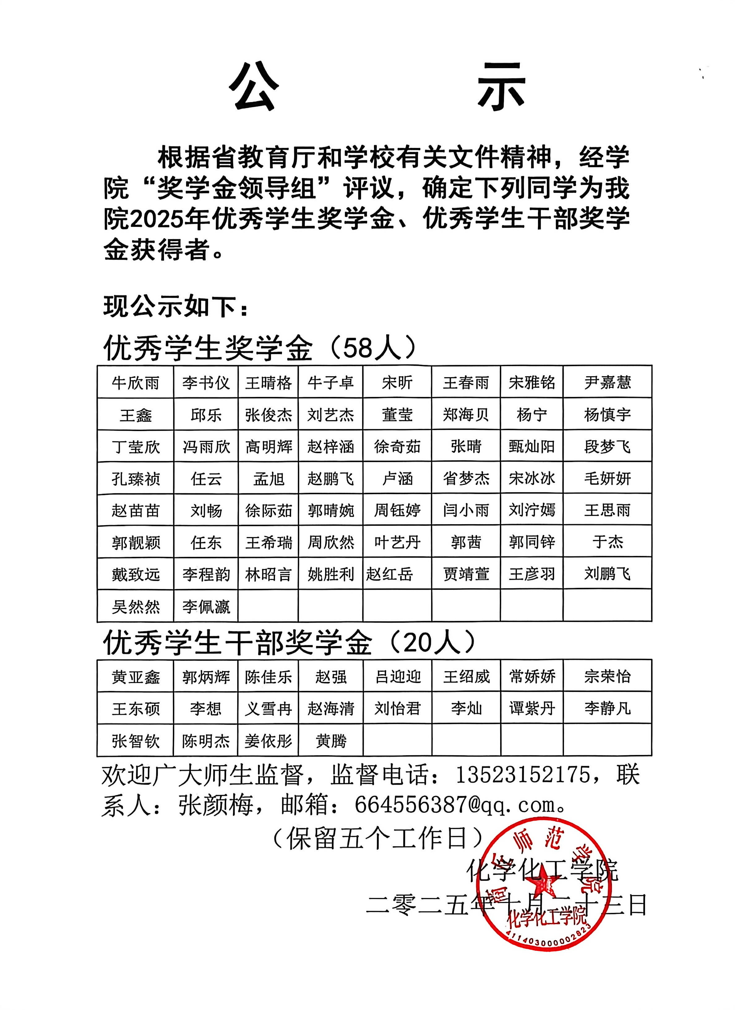 化学化工学院2025年优秀学生奖学金、优秀学生干部奖学金公示名单