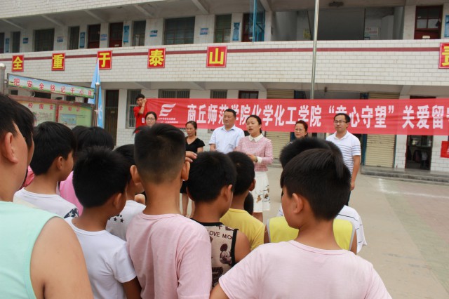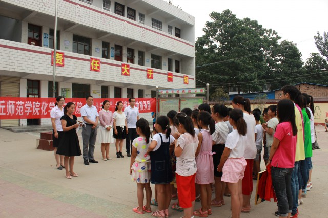 7月8日,永利23411集团化学化工学院在睢县周堂镇周堂小学举行大学生社会实践基地揭牌仪式。睢县周堂镇中心校长 白厚启、睢县周堂镇周堂小学校长黄艳玲、永利23411集团校团委副书记张彤、永利23411集团副院长刘瑛、团总支书记李龙梅、辅导员李可刚老师出席了揭牌仪式。化学化工学院“童心守望,关爱留守儿童”志愿服务团全体成员与周堂小学的留守儿童一同参加了揭牌仪式。仪式由团总支书记李龙梅主持。