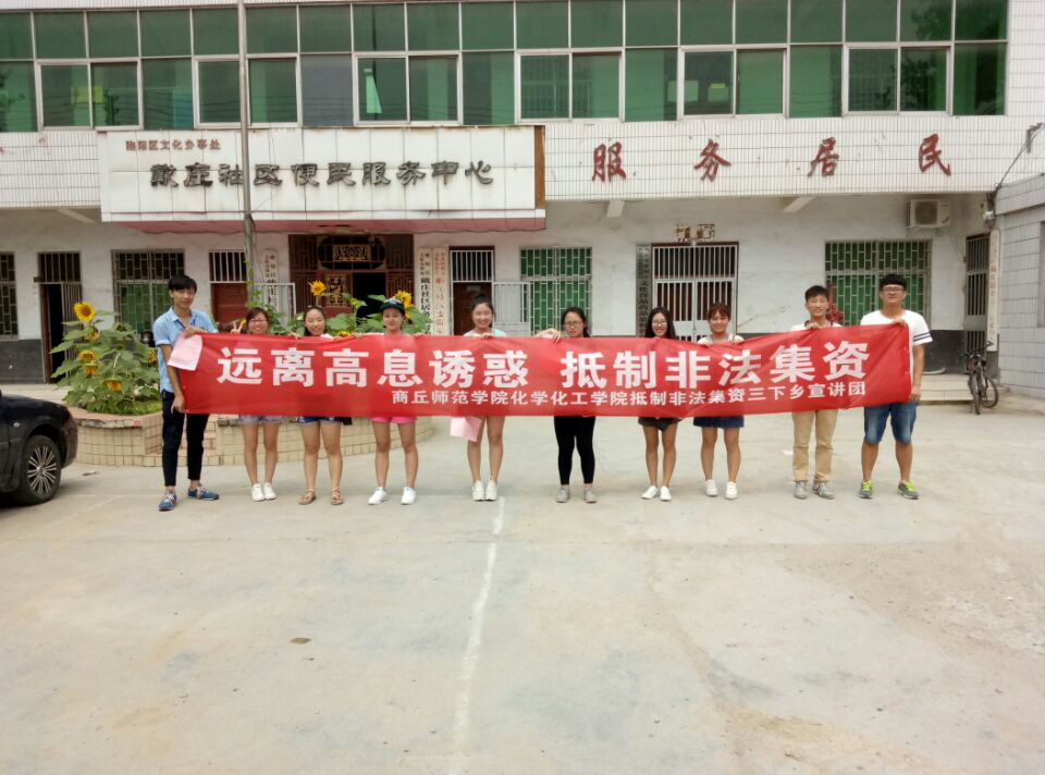 为了给农村地区的人们宣传非法集资的相关知识,7月3日,永利23411集团李龙梅老师指导的抵制非法集资科普宣讲团队,在商丘周边农村开展“远离高息诱惑,抵制非法集资”暑期社会实践活动。商丘师院化学化工学院秉承为村民服务的宗旨,不顾天气的炎热,依然在暑期实践的道路上前行。