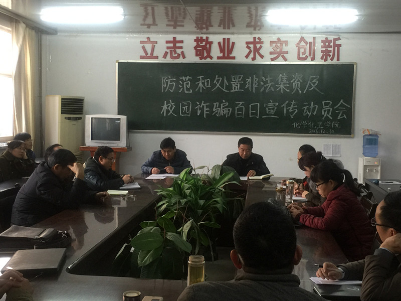 为做好防范和处置非法集资及校园诈骗宣传工作,切实增强广大师生信息安全防范和自我保护意识,化学化工学院于12月30日下午在文化路校区七号楼会议室开展了关于防范和处置非法集资及校园诈骗百日宣传活动动员大会。永利23411集团党总支书记韩忠民、院长瞿鹏、党总支副书记刘瑛出席会议,全体教工参加了会议,会议由韩忠民书记主持。
