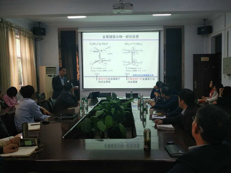 报告会上,杨国昱教授从氧合团簇化学的特点、研究和应用现状出发,提出当前该领域所面临的重要问题,并介绍了他们课题组基于缺位导向、缺位协同导向、导向组装、配体诱导、协同配位及自聚合与诱导聚集等学术思想所取得的一系列创新性研究成果,形成了独特的氧合团簇化学研究体系,不仅推动了氧合团簇化学的发展,而且被国内外同行多次引用和高度评价。李建荣教授介绍了其在金属有机多孔材料方面开展的工作。这类材料的结构和性能多样并且容易调控,在多个领域具有潜在的应用价值。李建荣教授在报告中介绍了近期在该领域的研究结果,包括MOPs的可控合成及新合成策略的发展和基于MOPs构筑单元的MOFs的设计合成及其在膜分离、气体吸附等领域的潜在应用。赵斌教授从金属有机框架(MOFs)的研究现状出发,向大家介绍了其团队主要工作:从金属节点的选择上进行创新,通过选用非常见低氧化态/构筑金属-金属键/高核数金属簇等手段,构筑新型MOFs,并从化合物的分子结构,电子结构及功能性方面进行研究。报告结束后,三位教授与在座师生进行了亲切交流并对学生提出的问题进行了解答。