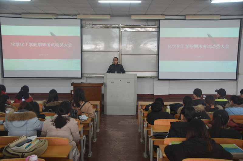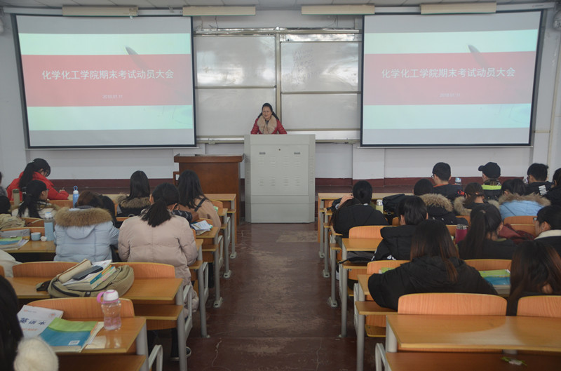 为促使2017-2018学年第一学期期末考试工作顺利进行,提高同学们对期末考试的重视程度。2018年1月11日下午,我院于文化路校区1#207和1#106教室召开了“化学化工学院期末考试动员大会”。党总支副书记刘瑛、团总支书记李龙梅和各年级辅导员老师出席此次会议。院全体学生参加了会议。大会由副院长孟团结主持。
