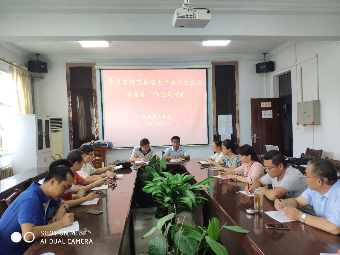 8月1日上午,化学化工学院党总支召开会议,专题学习贯彻落实中共河南省委十届六次全会暨省委工作会议精神。学院领导、部分老师参加了会议。会议由总支书记韩忠民主持。