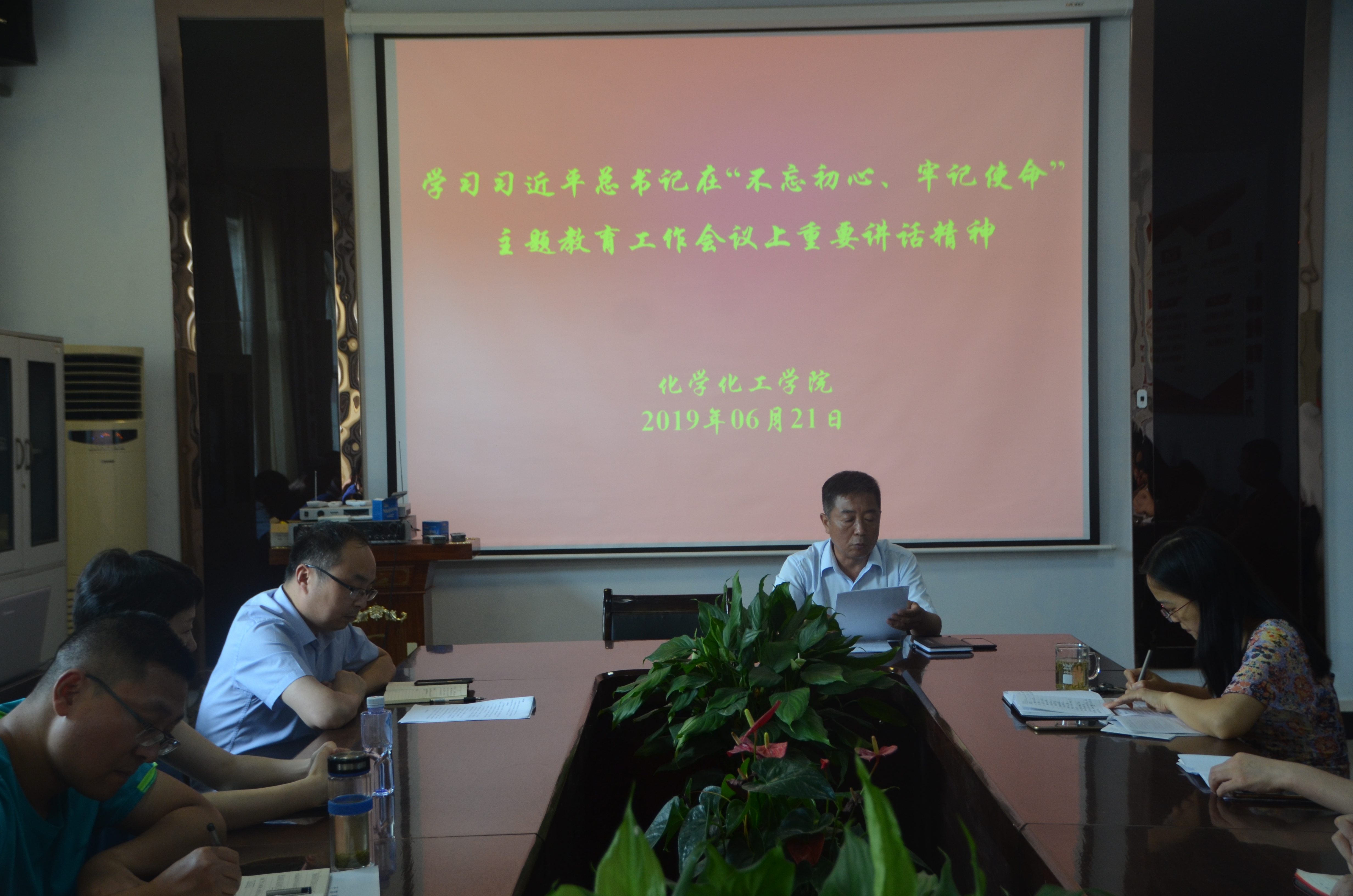 为了使中国共产党牢记初心使命,不断激励一代代中国共产党前赴后继、英勇奋斗,2019年6月21日,化学化工学院于睢阳校区7号楼会议室学习习近平总书记在“不忘初心、牢记使命”主题教育工作会议上重要讲话精神。全体教职工参加学习,会议由党总支书记韩忠民主持。