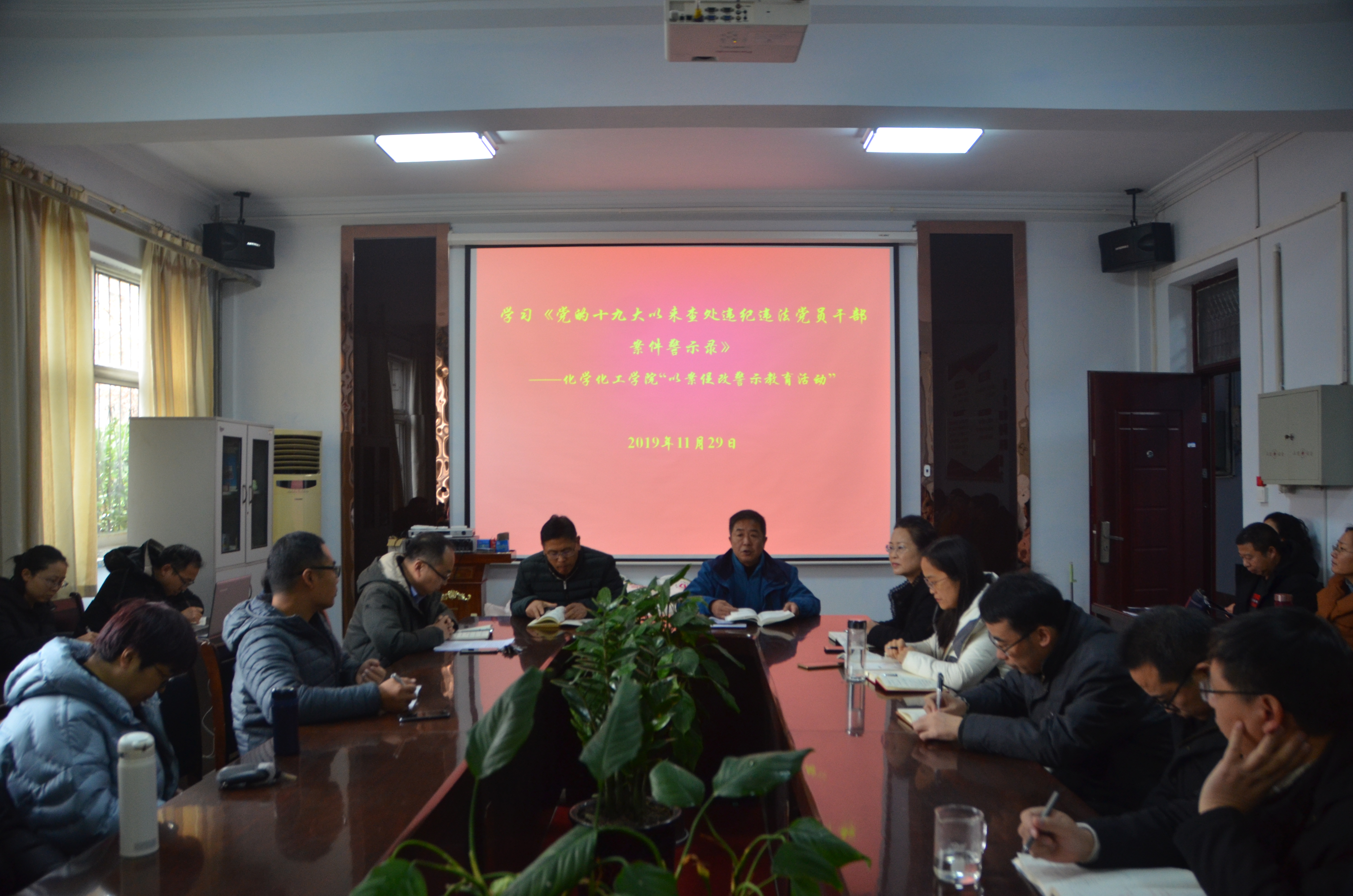 为贯彻党中央关于在全党“不忘初心,牢记使命”主题教育中深入开展警示教育、深刻剖析反面教材典型,以案例明法纪、促整改,推进主题教育走深走实,11月29号下午,化学化工学院于睢阳校区7号楼会议室组织学习《党的十九大以来查处违纪违法党员干部案件警示录》以案件促整改警示教育。全体教职工参加,会议由党总支书记韩忠民主持。