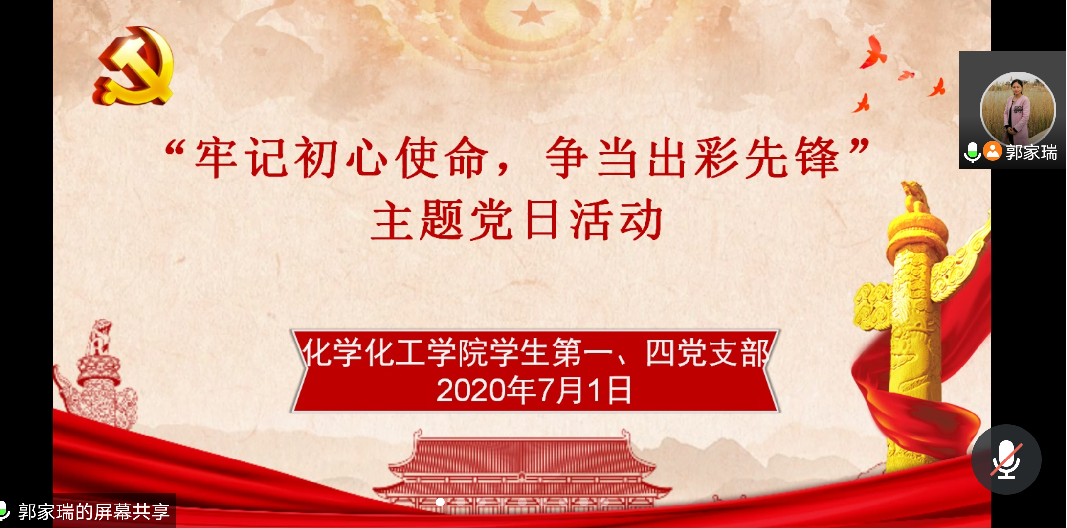 本次活动采取线下线上结合的方式开展,线下活动中,有的同志观看了红色影视、有的同志参加志愿服务或社会实践活动、有的同志就近瞻仰革命先烈等。7月1日下午,同志们通过线上会议,交流线下活动心得体会。上官鑫锋同志为我们分享了他对《我和我的祖国》这部影片的观后感,在这部影片中,让他从普通人的视角感受到祖国的发展和人民的情怀,激发了他的爱国热情。张宏毅同志和魏世民同志也向我们分享了他们的影片观后感,获得了大家的一致认同。随后付苏涛同志向我们分享了他为村委会打扫卫生做志愿服务的经历和心得,让我们懂得了党员就要做好带头作用,不怕苦不怕累,时刻以党员的标准严格要求自己。王江龙、杨苗苗、田梦格等几位同志也为我们分享了他们做志愿服务的心得。蔡莹同志分享了在家乡禹州市烈士陵园瞻仰革命先烈的体会。在他们分享完毕后,支部书记郭家瑞老师希望各位学生党员时刻铭记党的宗旨和和使命,时刻牢记党员身份,不怕吃苦,不怕困难,不忘初心砥砺前行。