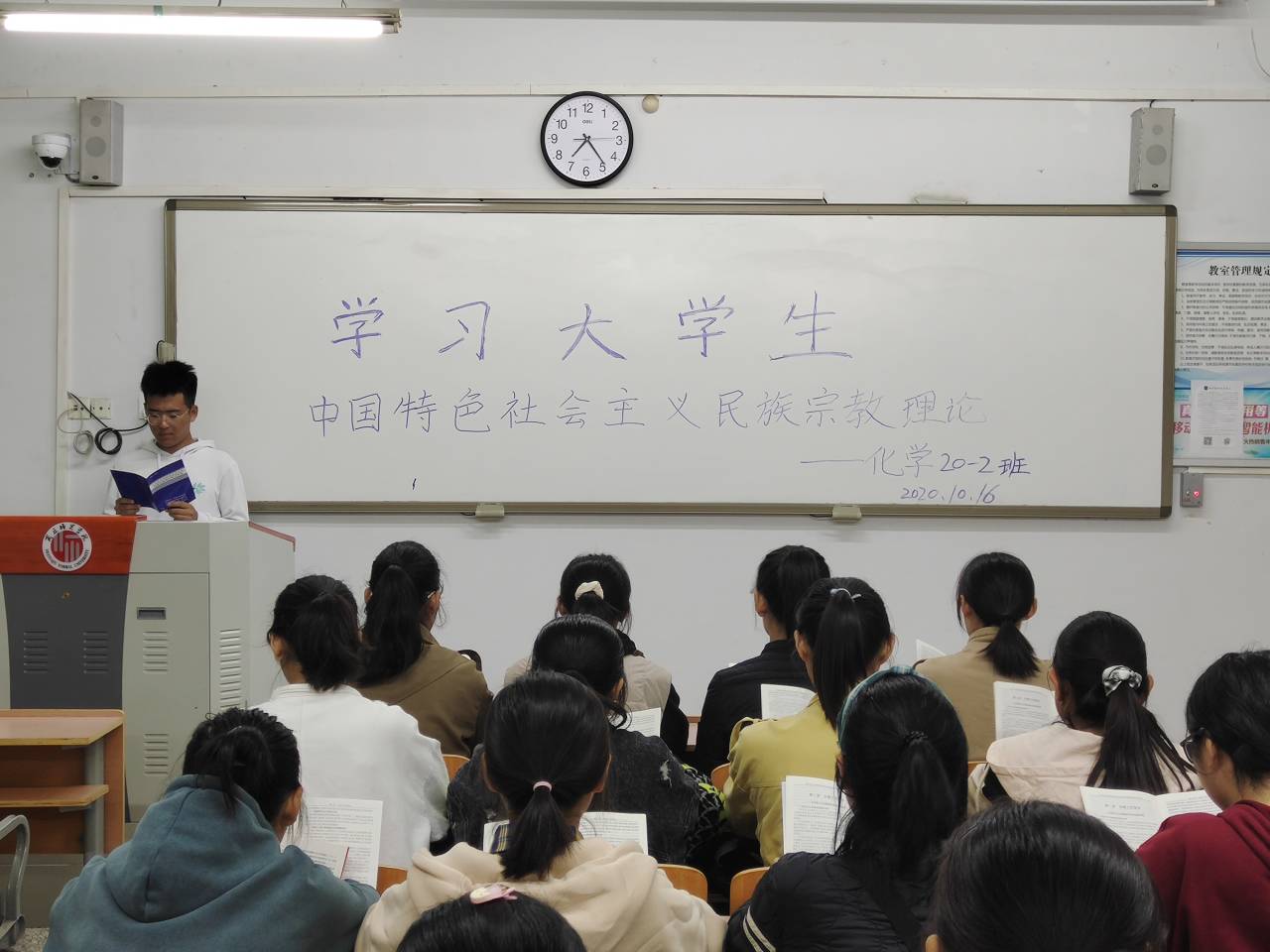 为使同学们正确认识和处理民族关系,坚持民族平等,加强民族团结,促进民族和谐。2020年10月16日,化学化工学院组织20级新生开展了“宗教政策法规和民族宗教政策理论”活动,20级全体同学参与。