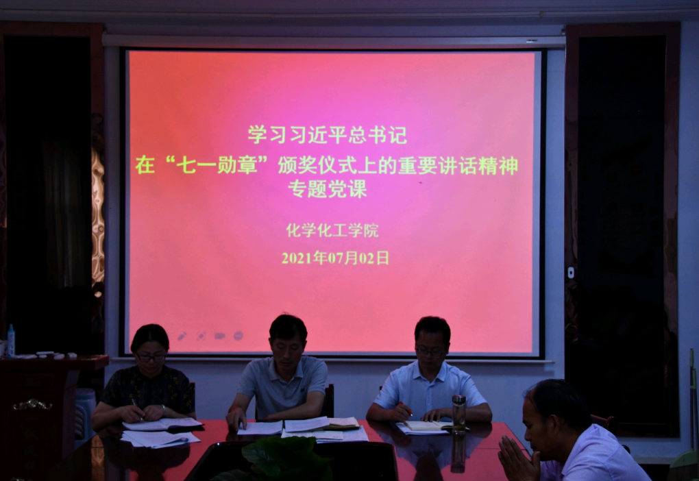 为引导广大党员干部以勋章获得者为榜样,追逐功勋党员身上耀眼的“三色光”,察己思齐、努力奋进,不断创造无愧于党、无愧于人民、无愧于时代的业绩,7月2日,化学化工学院在睢阳校区7号楼会议室组织开展了学习习近平总书记在"七一勋章"颁奖仪式上的重要讲话精神专题党课,院党委书记李海涛为授课人。