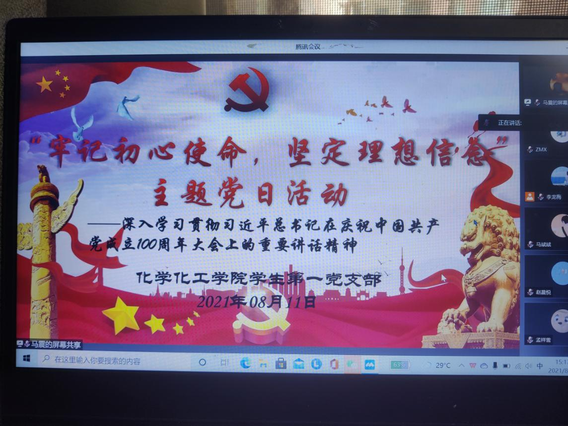 为深入学习习近平总书记在庆祝中国共产党成立100周年大会上重要讲话精神,深入领会“七一”重要讲话的重大意义,用“七一”重要讲话精神,培根铸魂启智润心,为学生成长成才增值赋能,8月3日-11日之间,化学化工学院学生各党支部在线召开深入学习“七一”重要讲话精神主题党日活动。