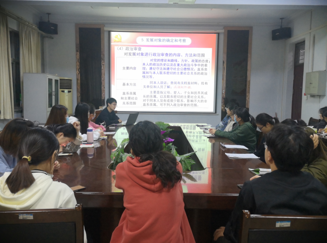 为确保党员发展质量,切实做好新时期党员发展工作。10月28日晚上,化学化工学院于七号楼会议室举行以“规范党员发展程序,科学做好党员发展工作”为主题的培训,培训由学工办副主任史展主讲,第49期入党积极分子参加。