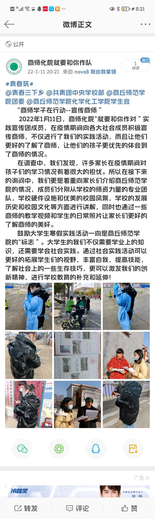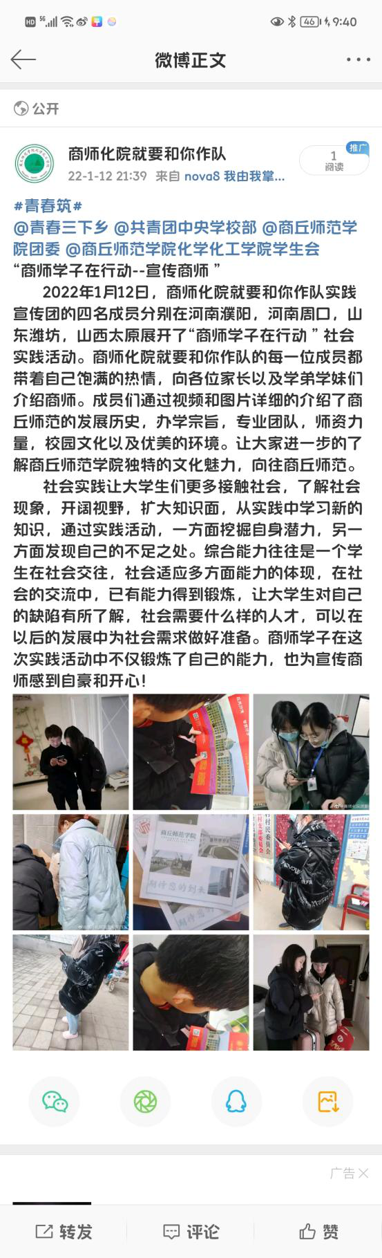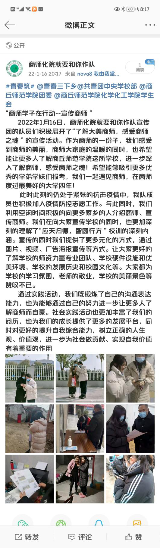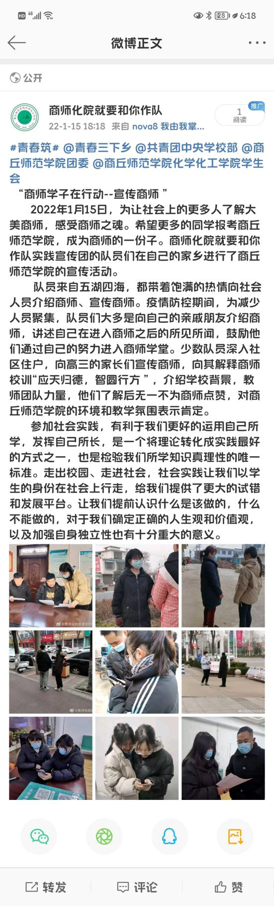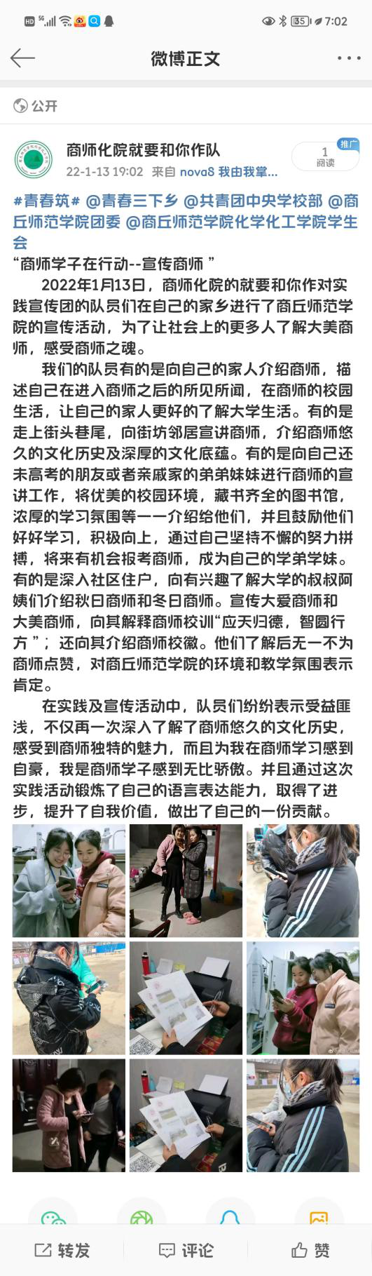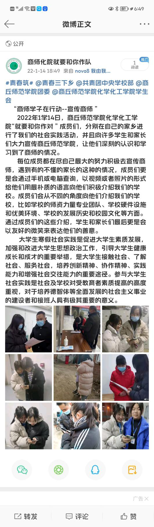 活动开展第七天,团队成员积极加入疫情防控志愿服务工作。与此同时,团队成员利用空闲时间积极向家人介绍商师、宣传商师。成员在向大家宣传学校的同时,也更加深刻的理解了“应天归德,智圆行方”的内涵。队员通过图片、视频、广告海报宣传等方式,让大家更全面的了解学校的师资力量、硬件设施、优美环境、发展历史和校园文化等。