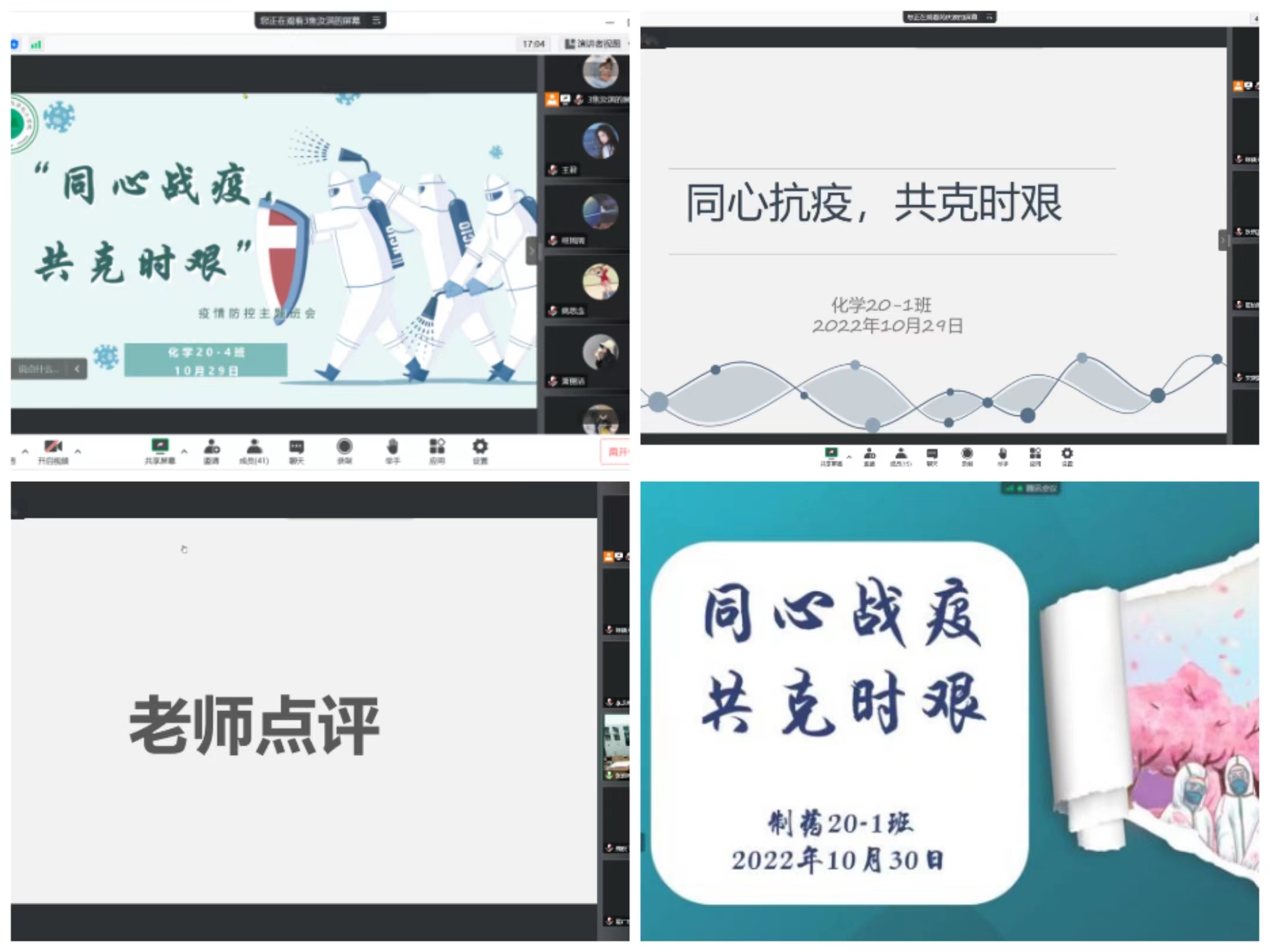 10月30日,2020级组织开展“同心抗疫,共克时艰”主题班会,辅导员李龙梅强调要认清疫情形势的严峻性,增强危机意识,在校园内正确佩戴口罩,按时核酸检测及时上报检测情况。张颜梅提出坚决不信谣、不传谣、不造谣,理解我校疫情防控规定,提高自身思想建设,提升自我品质素质,学会心理调节适当放松自我。