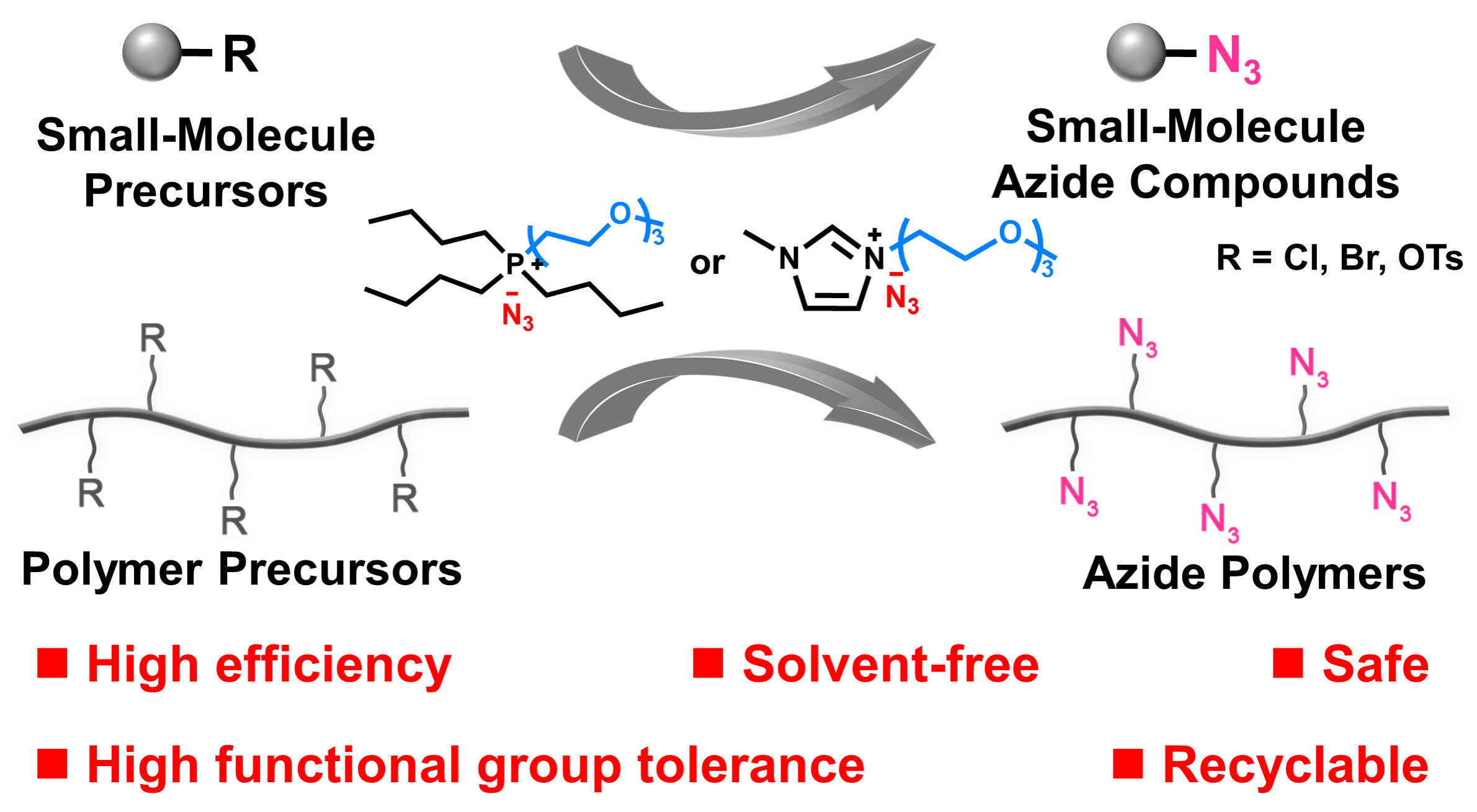 基于此,翟滨教授团队报道了一种基于叠氮离子液体的聚合物叠氮化方法。作者通过分子设计,在阳离子结构中引入三甘醇柔性基团,使离子液体具有适中的极性,良好的热稳定性和机械稳定性、低玻璃化转变温度和低粘度,并提高了聚合物在其中的溶解度。