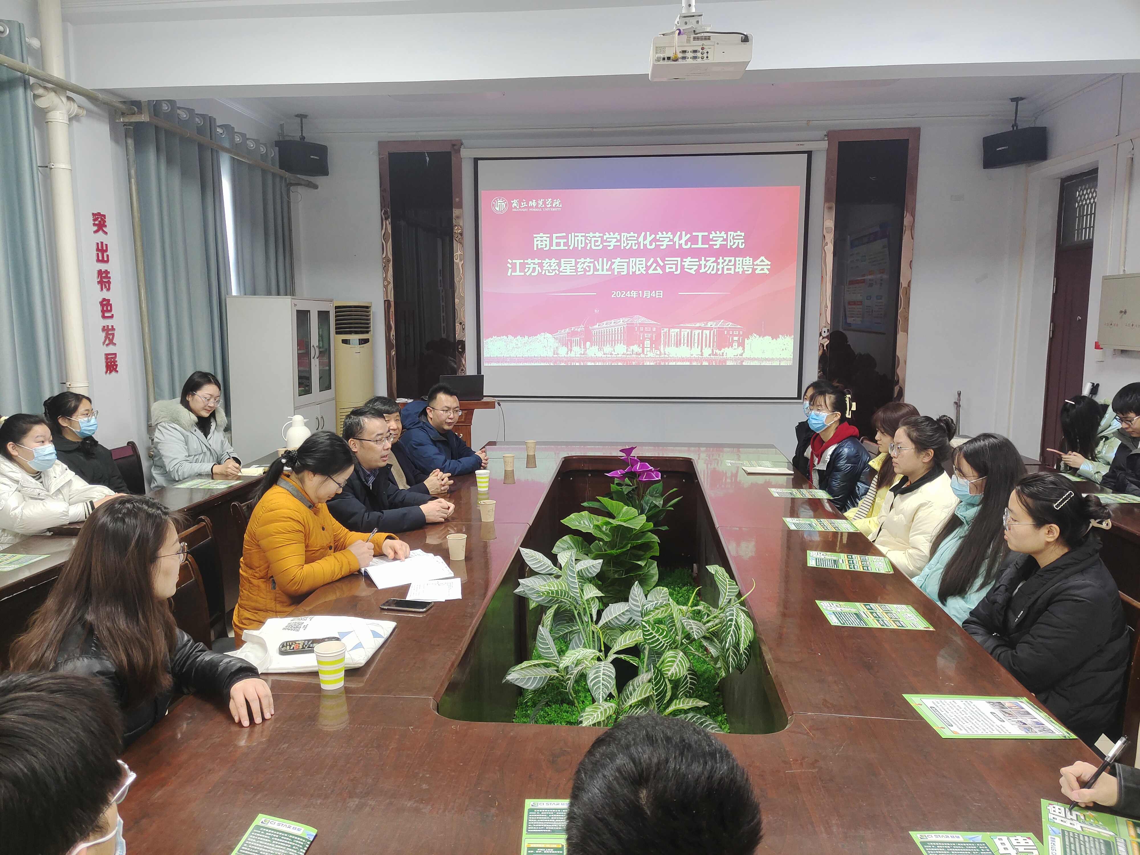 为进一步促进毕业生就业,积极主动为学生搭建就业服务平台,实现企业人才需求与毕业生有效对接,化学化工学院于7号楼学院会议室举行江苏慈星药业有限公司专场招聘会。江苏慈星药业有限公司总经理马德营(原商丘师专84届化学系毕业生)、人事总监樊万琪、人事经理孟雅萍、学院党委书记李海涛、院长张银堂、学院党委副书记张颜梅出席,学工办副主任郭冠群、组织员王舒欣和辅导员李龙梅以及2024届部分毕业生参加。招聘会由张颜梅主持。