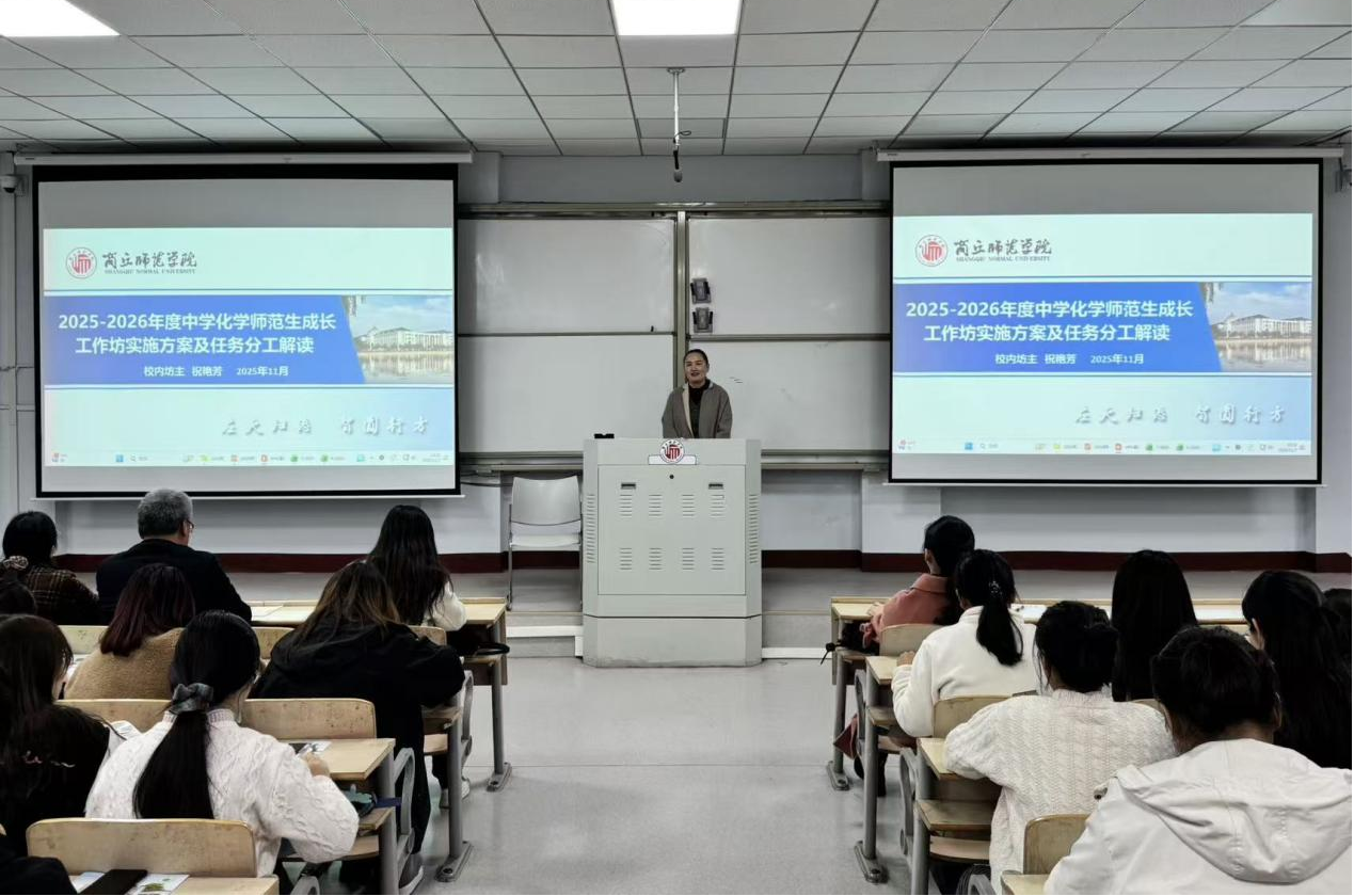 为进一步提升师范生实践能力与教育教学能力,11月7日,化学化工学院在睢阳校区1号教学楼208教室举行了2025-2026学年度“人工智能+”师范生成长工作坊启动仪式。来自商丘市基础教育研究中心、商丘市第一高级中学、商丘市高级中学的5名中学化学一线名师,副院长王涛,化学系副主任刘孜,教师代表及2023级全体师范生参加了会议。
