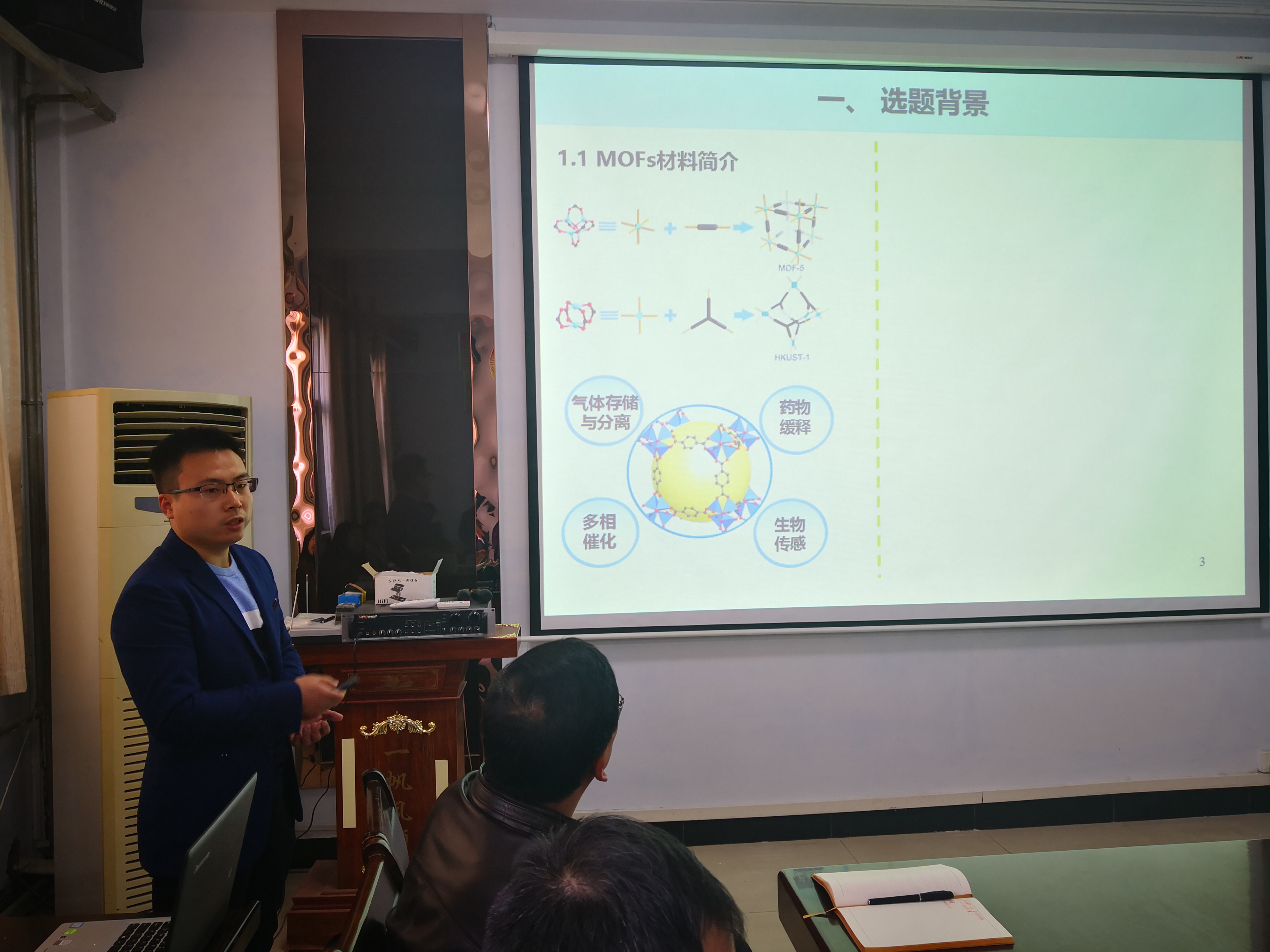 张建伟博士向大家汇报了读博期间的主要科研工作,即高稳定性三核簇基MOFs材料的可控制备和性能调控,通过晶体结构与性能之间的探究,在气体存储与分离研究领域,建立了多种有效合成策略来调控晶体结构,并得到了一系列研究成果。目前,取得的部分重要研究成果已整理成6篇文章,并以第一作者发表在国际期刊上:Chem. Commun.,Chem. Eur. J.,Cryst. Growth Des.,Dalton Trans.,CrystEngComm。最后,现场教师和张建伟博士就MOFs材料的合成、结构表征以及相关动态气体分离的改进方案进行了深入的交流。