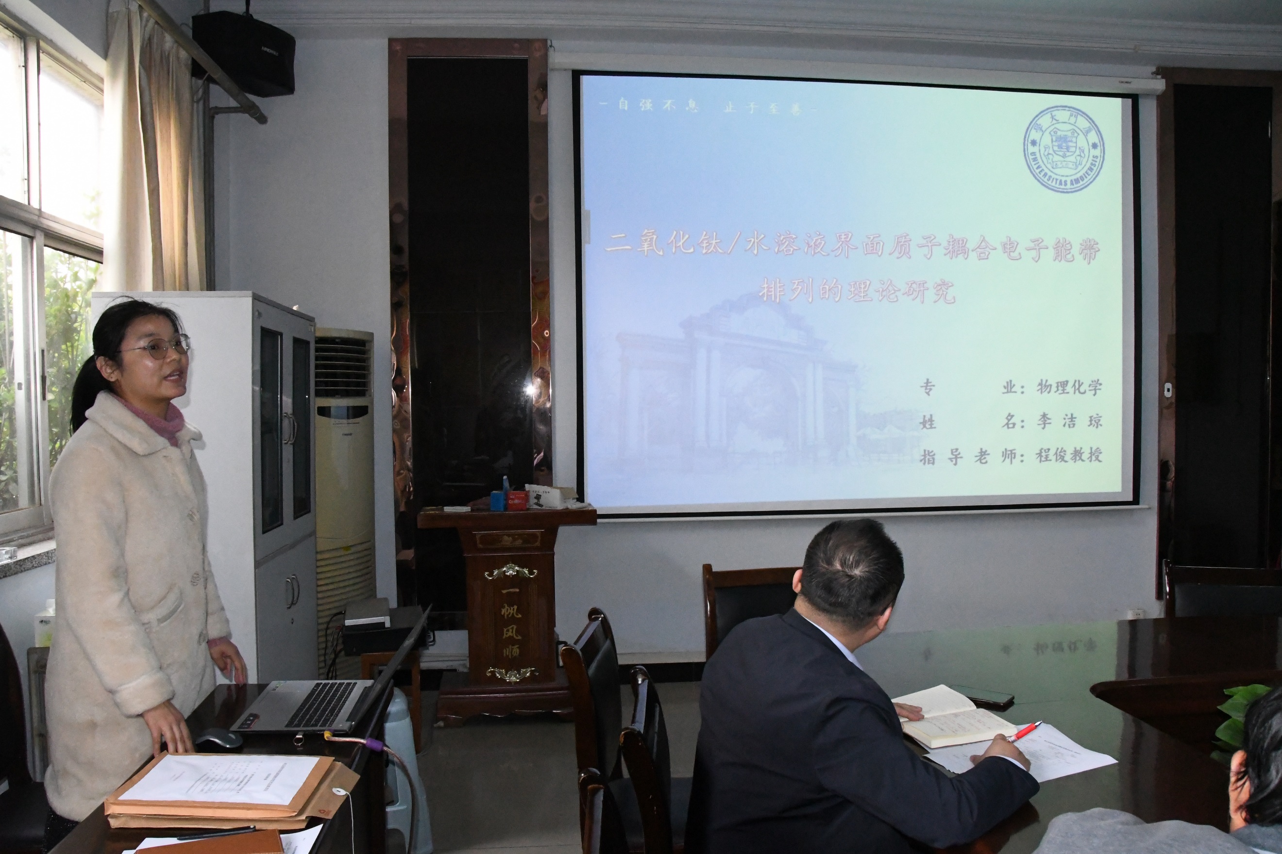 2021年03月05日下午,永利23411集团化学化工学院进行了本学期第一期博士论坛。青年教师李洁琼博士在睢阳校区7号楼化学化工学院一楼会议室做了题为《二氧化钛/水溶液界面质子耦合电子能带排列的理论研究》的学术报告。本次博士论坛由副院长周艳丽主持,化学化工学院全体教师参加了论坛。