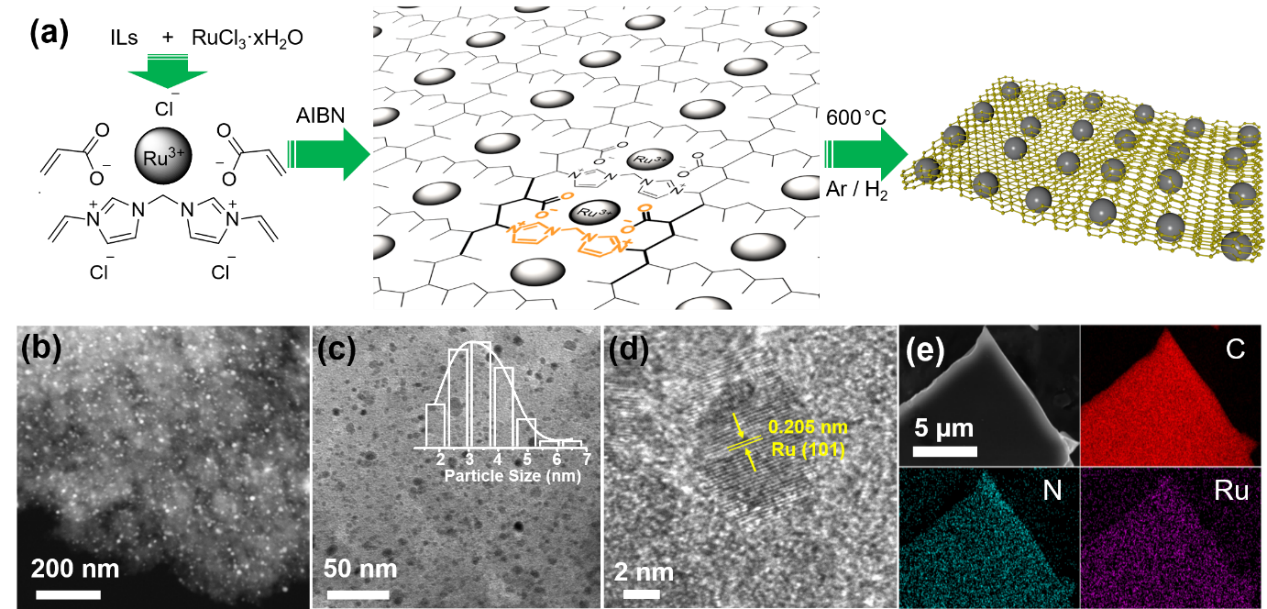 图(a)离子液体原位限制聚合制备Ru基电催化剂的示意图。(b)HAADF-STEM图像;(c)TEM图像(插图:Ru NPs的粒度分布);(d)HRTEM图像;(e)SEM图像和EDX图谱。