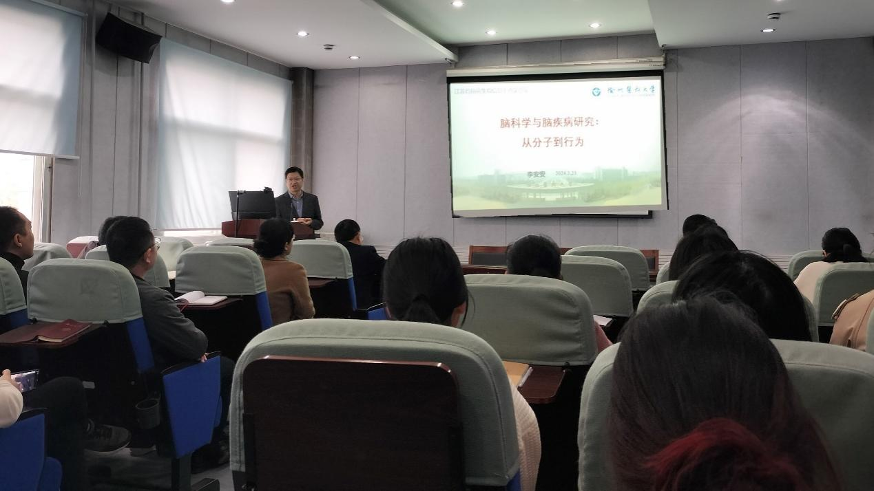 交流会分为两个阶段。第一阶段,李安安教授作了题为《脑科学与脑疾病研究:从分子到行为》的学术报告,深入浅出地阐述了脑科学领域的最新研究成果和前沿技术,将科学理论与实践相结合,引领听众深入了解脑疾病的分子机制及其对行为的影响。