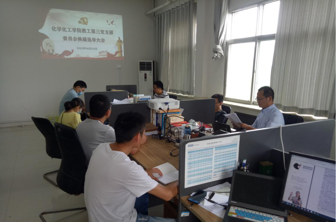 根据《中国共产党章程》、《中国共产党基层组织选举工作暂行条例》等规定,化学化工学院教工第三党支部本届委员会届期已满,按照学校党委的要求,经化学化工学院党总支同意,2020年6月29日上午,化学化工学院教工第三党支部在化学实验楼416室召开换届选举大会,会议由原支部书记王涛主持,党支部全体党员参加会议。