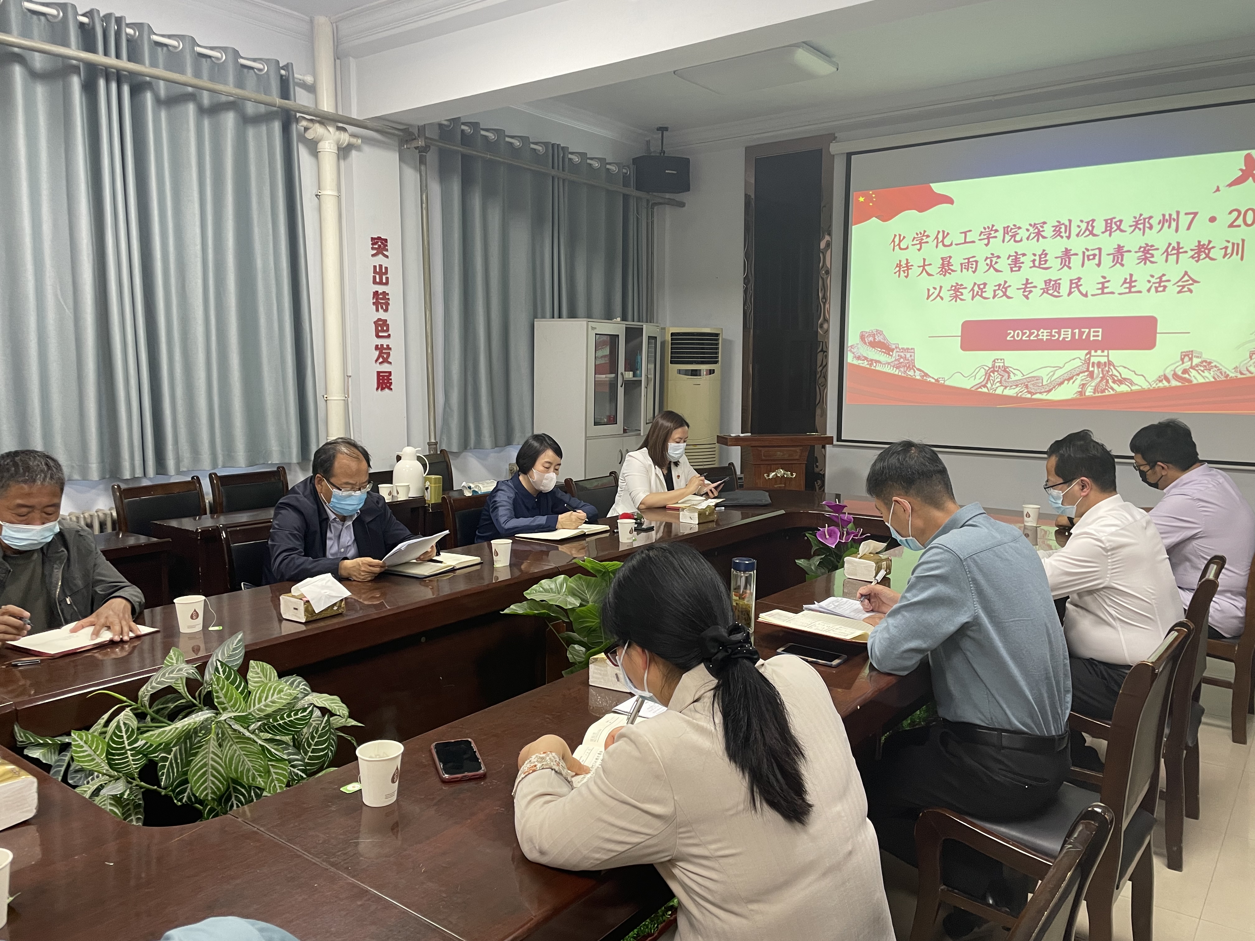 按照《中共永利23411集团委员会<关于深刻汲取“7·20”特大暴雨灾害追责问责案件教训开展以案促改专题民主生活会的通知>》要求,5月17日下午,化学化工学院召开郑州“7·20”特大暴雨灾害以案促改专题民主生活会。学校专题民主生活会第八指导组组长、副校长郭文佳和指导组成员统战部部长黄蕾、纪委第一纪检监察室主任任鸿敏以及学校纪检监察员监督指导组组长韩忠民莅临指导。院党政领导班子成员参会,河南省生物分子识别与传感重点实验室副主任朱旭、药物绿色合成河南省工程实验室主任李峰列席会议。会议由院党委书记李海涛主持。