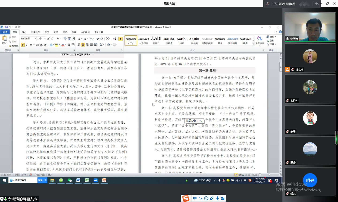 之后,李海涛带领大家学习了《条例》修订的背景意义、遵循的主要原则、修订的主要内容对加强党的政治建设、基层党组织建设以及党员队伍建设等新要求新任务。随后,李海涛表示此条例的修订和实施,对于全面贯彻党的教育方针,落实立德树人根本任务,建设高质量教育体系,培养社会主义建设者和接班人,具有十分重要的意义。最后,李海涛要求各位书记深刻认识到条例中的背景和意义,认真学习工作条例,在学懂弄通上下功夫,扎实工作,全面贯彻履行五项职能,推动“两个责任”贯通联动,一体落实。