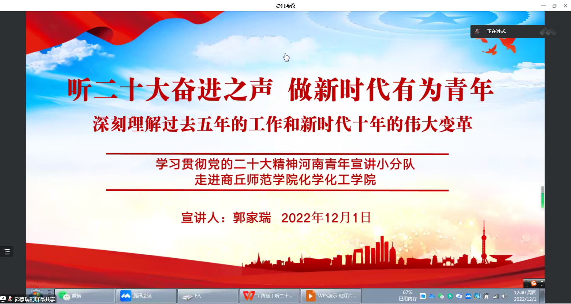 为落实分党校预备党员的培训制度,引导学生预备党员深入学习贯彻党的二十大精神,12月1日中午,化学化工学院党委在线开展了第三场预备党员培训,学生第四党支部书记郭家瑞为参训学员上了题为“听二十大奋进之声,做新时代有为青年--深刻理解过去五年的工作和新时代十年的伟大变革”的党课,学生预备党员参加。