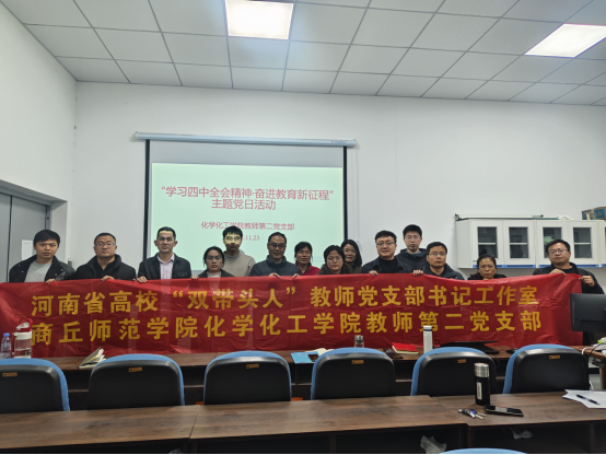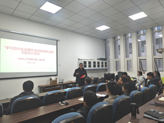 2025年11月23日,永利23411集团化学化工学院教师第二党支部成功举办“学习四中全会精神·奋进教育新征程”主题党日活动。活动聚焦学习贯彻党的二十届四中全会精神,组织全体党员认真研读《中共中央关于进一步全面深化改革、推进中国式现代化的决定》,深刻领会“新阶段、新理念、新格局、新实践”这一“四个新”重大部署的战略意义和丰富内涵。会议强调了将思想和行动统一到全会精神上来的重要性,为在新征程上推动学院事业发展筑牢思想根基。