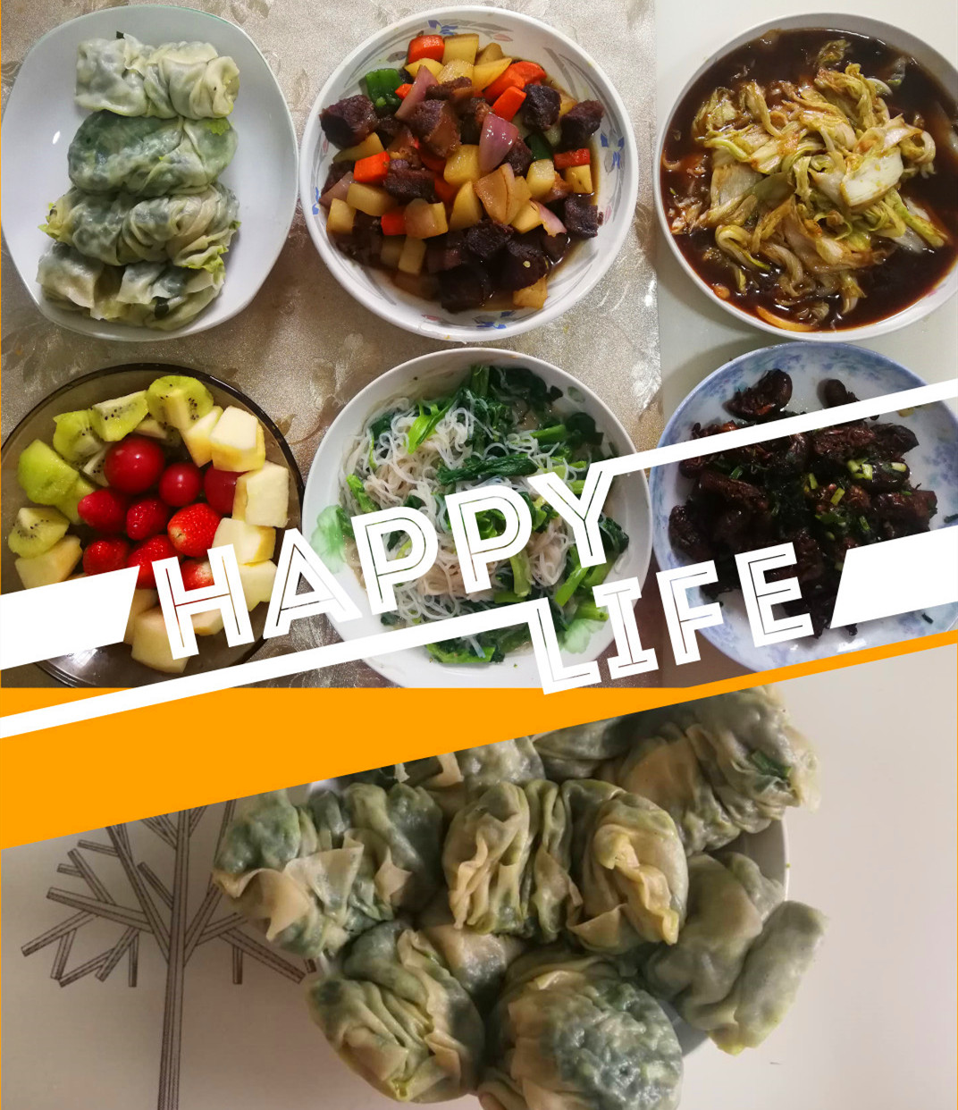 教师群内伴随着一阵阵的欢声笑语,一双双巧手操弄着厨刀切、雕、砍,挥舞着锅铲不停地翻炒,在各自家中,各显其能,纷纷亮出自己的绝活:“红烧排骨”、“焦炸菜丸”、“特色花生”“百果虾球”、“自制油条”、“葱花油饼”、“云朵面包 ”、“巧媳妇手擀面”、“麻辣虾尾”、“油焖龙虾”、“手工水饺”、“孜然羊肉”等各类美食扑鼻馨香。