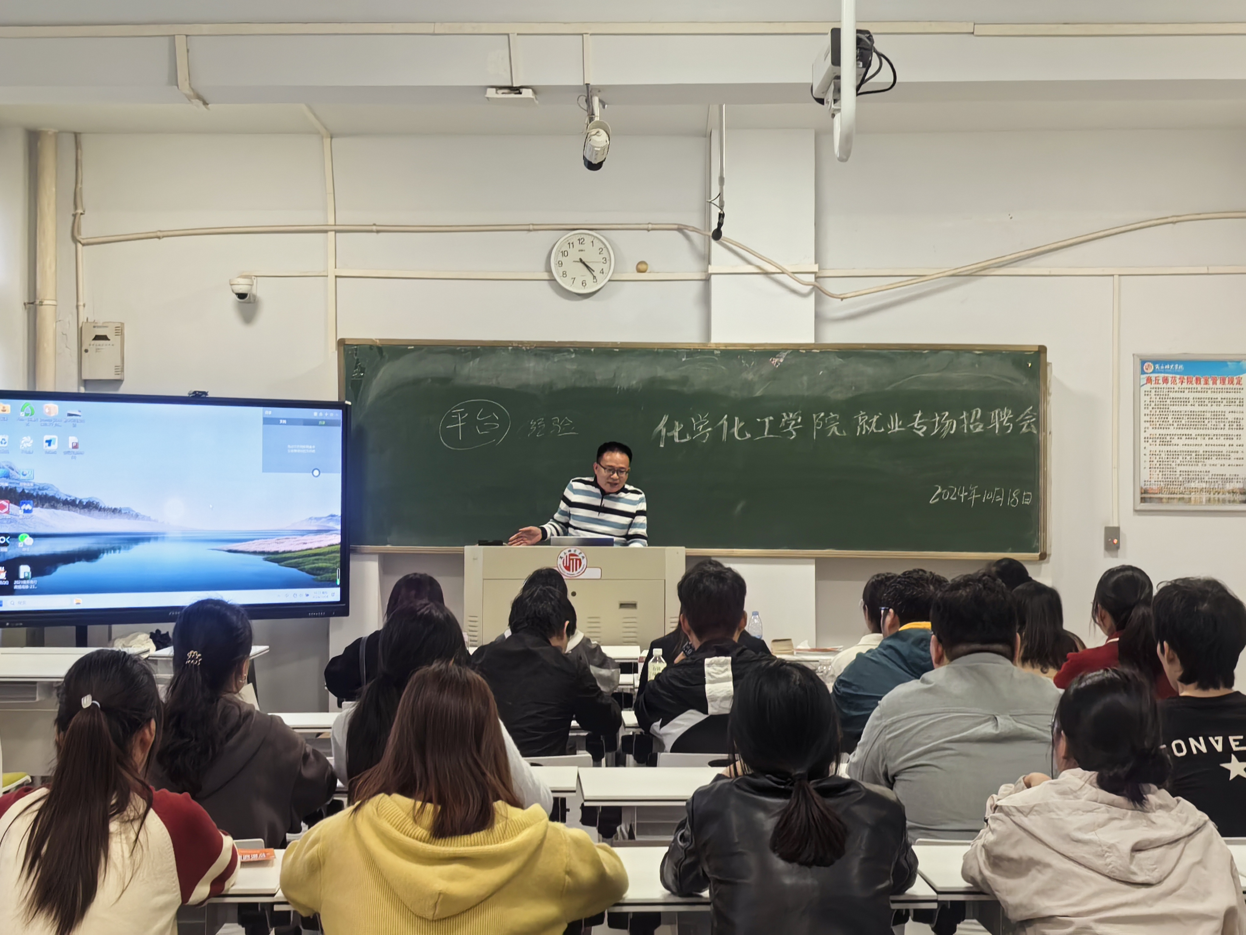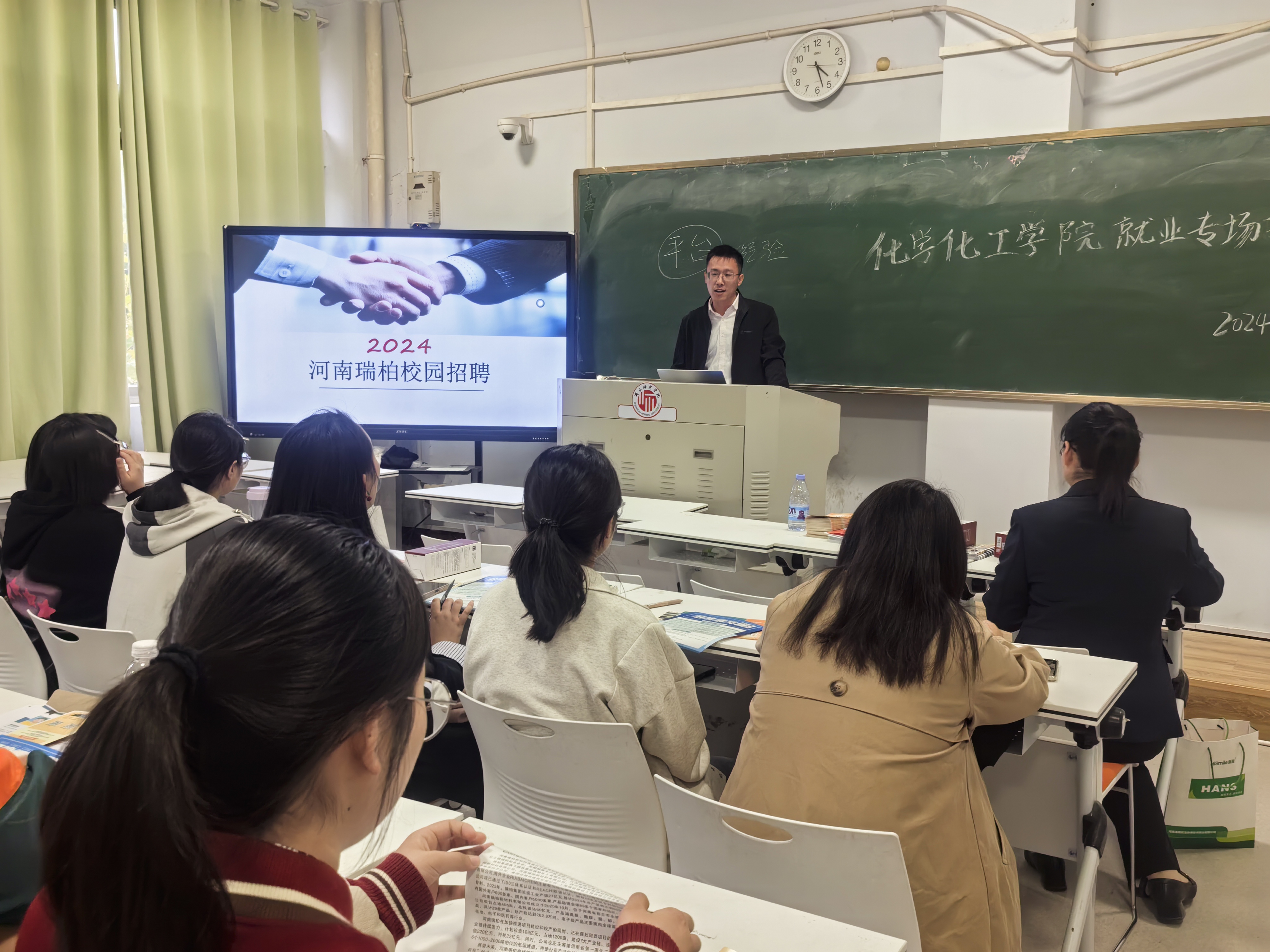 10月18日,化学化工学院举办了就业专场招聘会,邀请到河南瀚斯作物保护有限公司、惠州市德富晟新材料有限公司、河南瑞柏新材料有限公司三家企业进行就业宣讲。学院党委副书记张颜梅、2025届毕业生辅导员郭家瑞出席活动。活动由张颜梅主持。