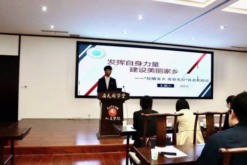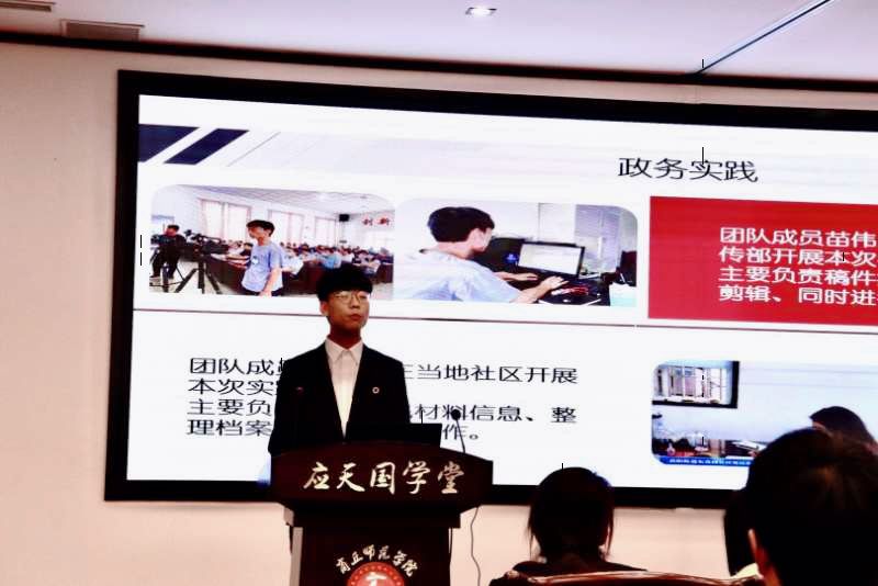“反哺家乡,青春先行”实践团队的汇报人苗伟光从政务实践,社区公益,兼职锻炼这三个方面来为大家讲述了他和团队积极参与到家乡的建设中的故事。