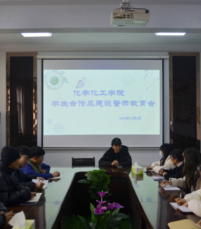 为进一步推进化学化工学院学生会改革,全面加强学生会作风建设,深入学习贯彻全国学联二十七大会议精神以及习近平总书记贺信和党中央致词精神。2020年12月2日,化学化工学院学生会于睢阳校区7号楼会议室召开“学生会作风建设警示教育会”,会议由化学化工学院学生会主席刘仲宇主持,团总支·学生会全体成员参加。