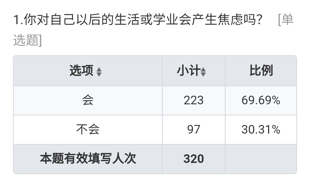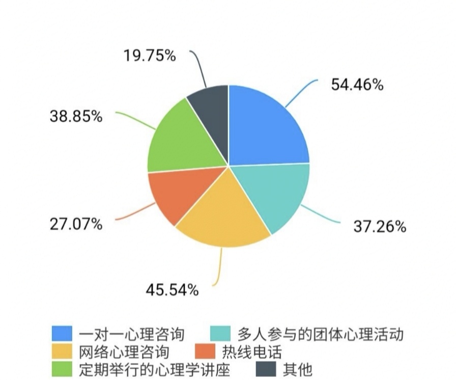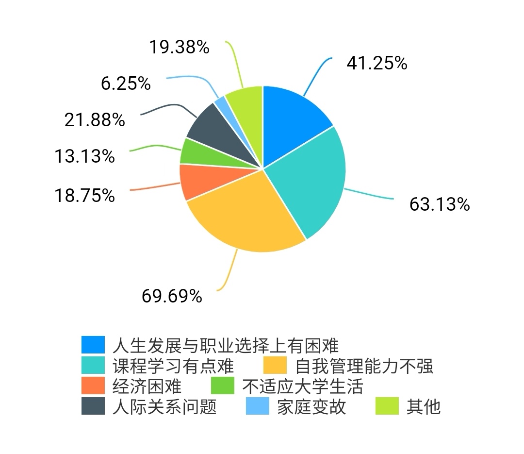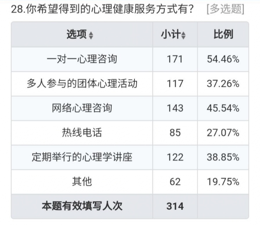 本次问卷调查采取随机抽样调查的方式,从化学化工学院18、19、20级学生中抽取一部分为代表反映整体调查情况,面向现代大学生学业和生活方面的问题进行调查。调查显示,部分同学对自己以后的生活或学业会产生焦虑,当遇到压力或烦心事时向老师求助较少而更多的是选择自己缓解,且常会有自我管理能力不强、课程学习有点难、人生发展与职业选择上有困难等诸多烦扰。根据调查分析得知,将近半数大学生希望得到一对一心理咨询、网络心理咨询等心理健康服务方式。