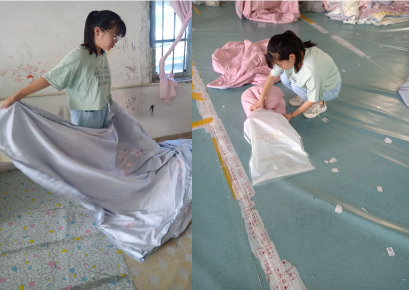 在实践活动中,田亚茹体验了翻被罩,缝床单,叠棉被,整布料等工作,亲身体会到每个岗位工作的繁忙与辛苦。整理被罩,需要不停抖动才能将其翻面,以供下一环节人员使用。使用缝纫机时要一刻不停地注视针脚,且两只手要一直按着床单,使其保持绷紧状态。每一个环节都不轻松,也不容松懈,因为一个人的失误就会导致其他人的心血白费。经过走访工人了解到,现在工坊的工作环境、安全保障以及工人的安全生产意识有大大提高了,而且工人们的待遇也变得更好。