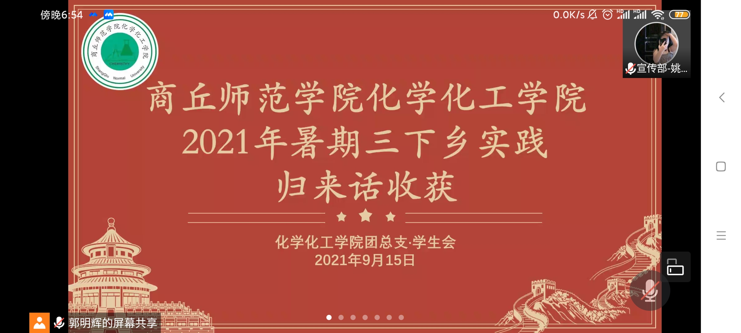 9月15日,化学化工学院在线开展2021年线上暑期“三下乡”归来话收获活动。院党委副书记张颜梅、团总支副书记郭家瑞、学工办副主任史展、辅导员李宁娅参加了此次活动。