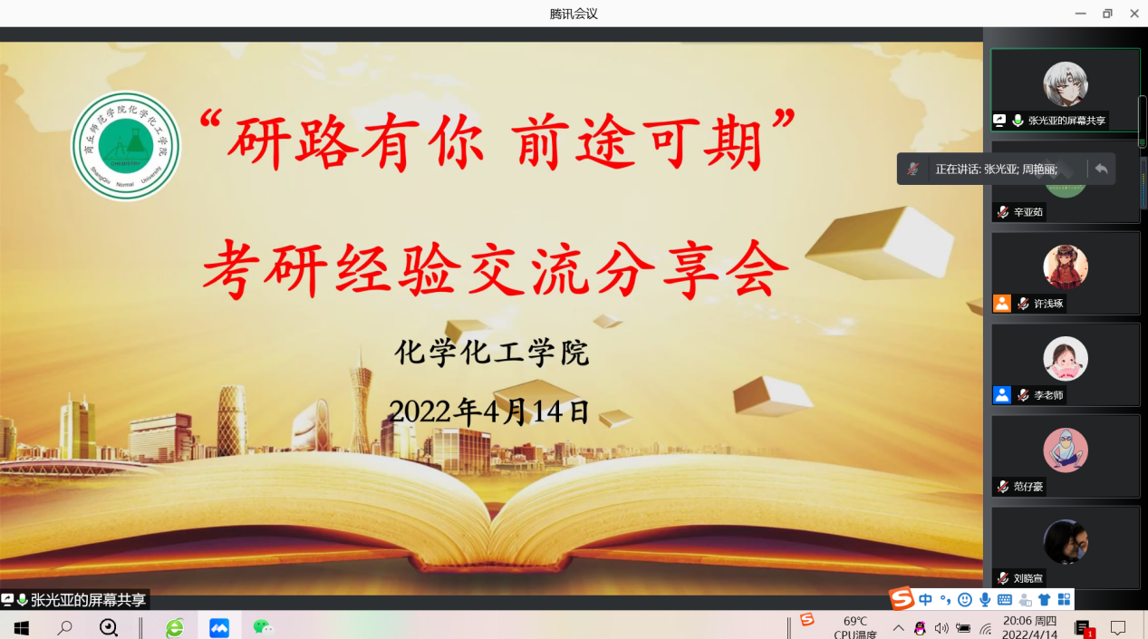 为帮助2019级同学明确考研目标,树立考研信心,深入了解考研招生政策和相关备考技巧,营造良好的学风建设。4月14日,化学化工学院于睢阳校区1#307教室开展了以“研路有你,前途可期”为主题的考研经验交流分享会。此次会议采用线上、线下相结合的方式,副院长周艳丽,2019级辅导员、班主任及所有学生参加,会议由副院长王涛主持。