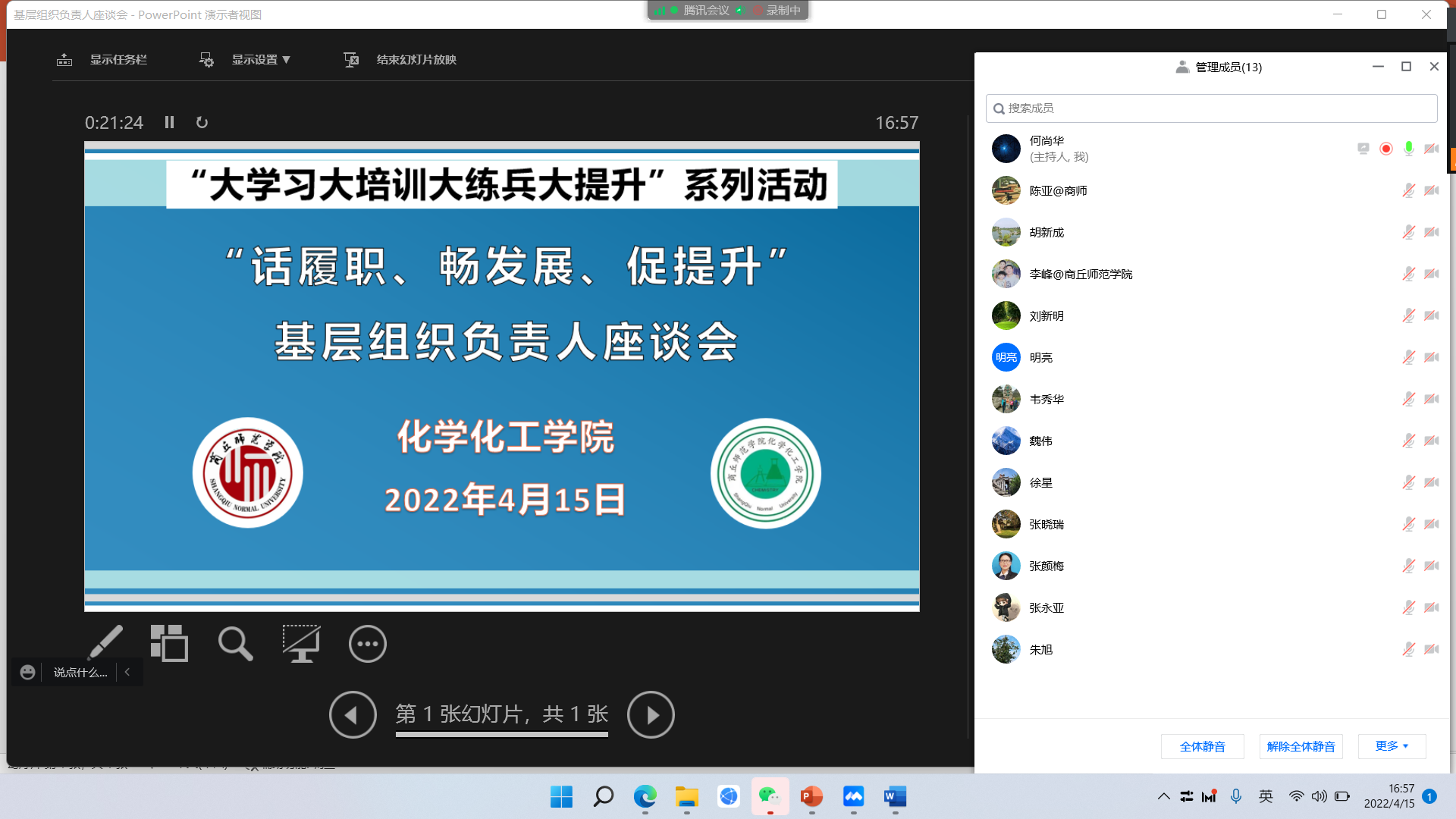 4月15日,永利23411集团召开“话履职、畅发展、促提升”基层组织负责人培训交流座谈会,会议以线上线下相结合的形式进行,学院领导班子成员、基层教学组织负责人出席会议,会议由副院长王涛主持。