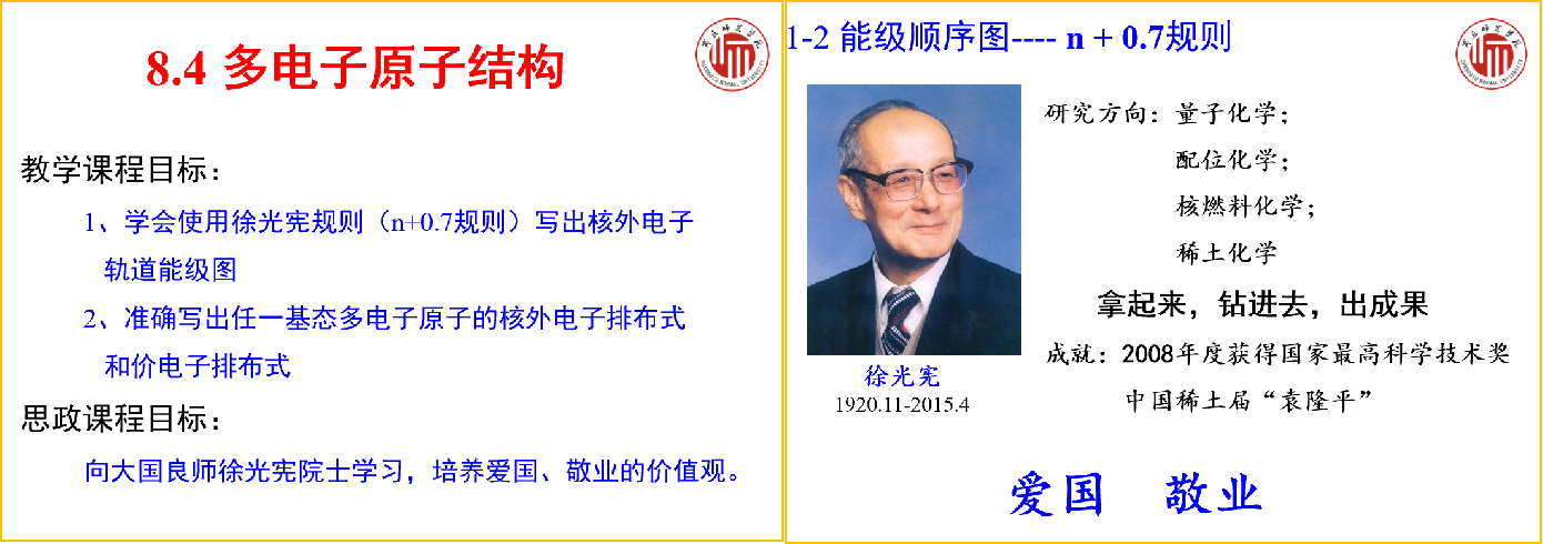 本节课有机融入课程思政元素,课前让同学们自行查阅徐光宪院士的资料,课中和同学们交流讨论,倡导同学们学习徐光宪先生爱国、敬业的精神,课后推荐学生阅读《一清如水—徐光宪传》这本书,进一步了解徐先生的伟大成就和爱国情怀。