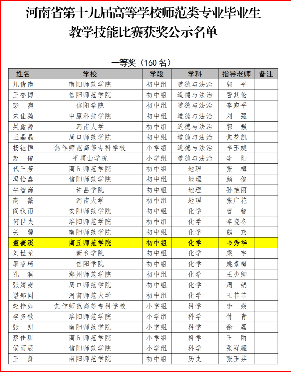 2022年4月10日,由河南省教育厅主办的河南省第十九届高等学校师范类专业毕业生教学技能比赛分赛在我校顺利举行。经过院内初赛,校内复赛,由韦秀华老师指导的18级化学(师范)专业董筱溪同学在第十九届高等学校师范类专业毕业生教学技能比赛中荣获初中化学组一等奖。