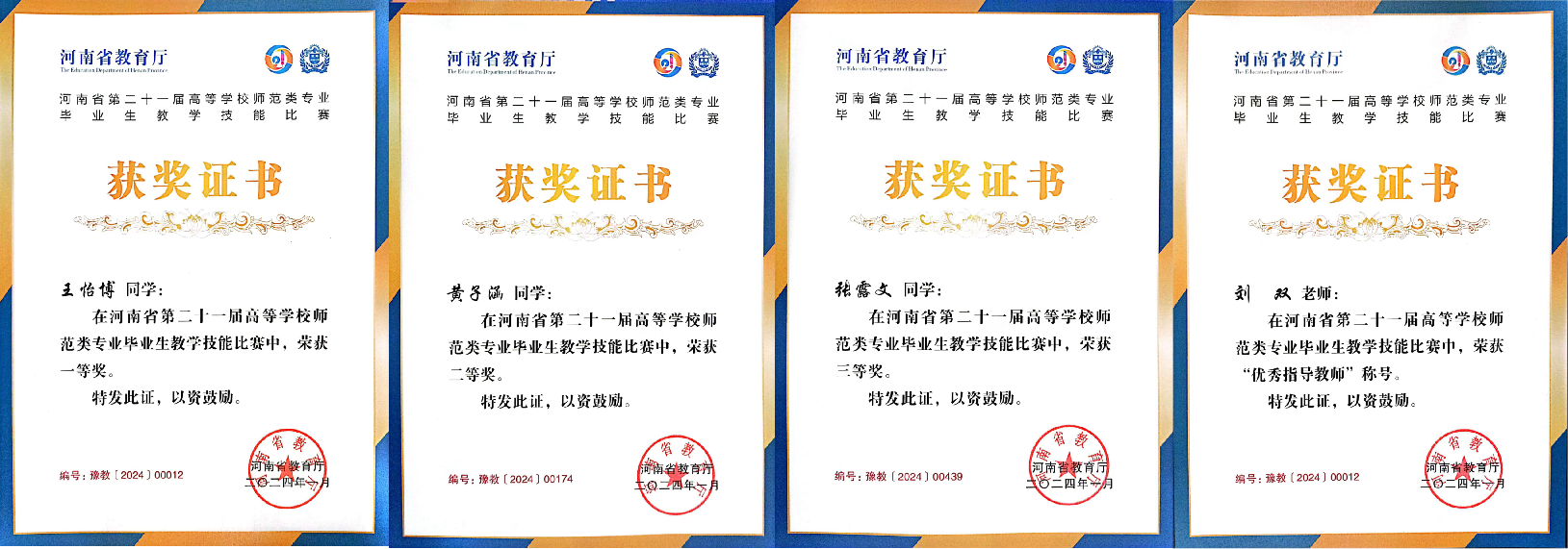 2024年1月4日,河南省教育厅发布了《关于公布第二十一届高等学校师范类专业毕业生教学技能比赛结果的通知》(教办师〔2024〕4号),永利23411集团王怡博同学获得一等奖,黄子涵同学获得二等奖,张露文同学获得三等奖,刘双老师获得“优秀指导教师”奖。