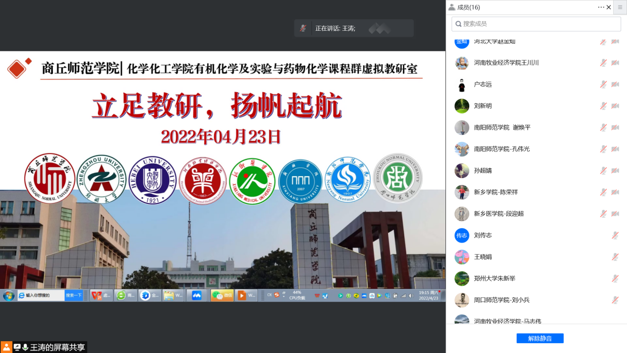 为贯彻落实“十四五”教育发展规划,适应信息化时代全面提高教师教书育人能力的需求,根据《教育部关于加快建设高水平本科教育全面提高人才培养能力的意见》、《教育部关于深化本科教育教学改革全面提高人才培养质量的意见》等文件精神,永利23411集团积极推进虚拟教研室建设工作,依托制药工程专业,联合郑州大学、河北大学、新乡医学院、南阳师范学院、周口师范学院、新乡学院、河南牧业经济学院等高校相关专业师资,组建了“有机化学及实验与药物化学课程群虚拟教研室”,并于4月23日召开“立足教研,扬帆启航”虚拟教研室启动会,教研室全体老师参会,会议由副院长王涛主持。