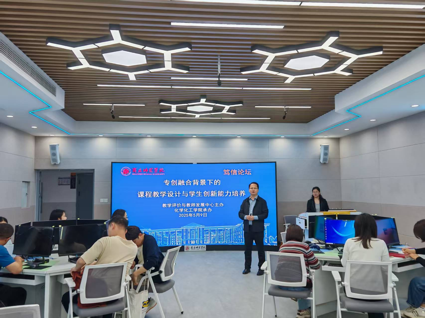 2025年5月9日,由教学评价与教师发展中心主办、化学化工学院承办的“笃信论坛”在睢阳校区工科实训楼北楼B-310室举行。化学化工学院于丽敏老师以《专创融合背景下的课程教学设计与学生创新能力培养》为题作分享,论坛由副院长王涛主持。